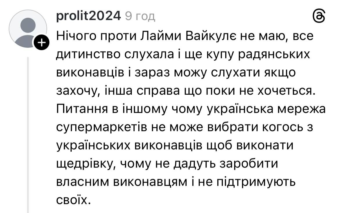 - "Вы этой идеей о "дружбе народов" только обесценили нашу страну, наших исполнителей и нашу культуру. В других странах же очень много действительно проукраинских исполнителей, но вам импонирует совковая госпожа Вайкуле, которую вы притянули в свой ролик и наше медиапространство. Жаль вас, жаль нашу страну, потому что Россия из нее никак не может вылезти";