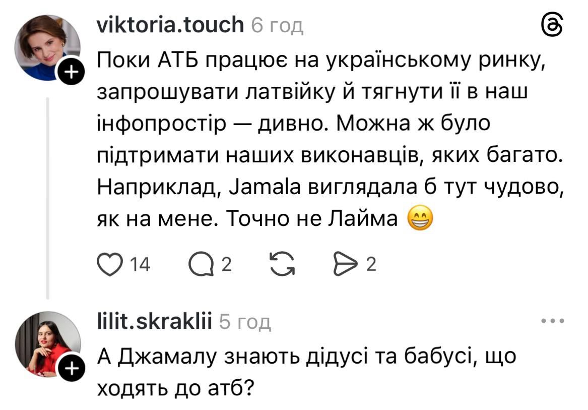 Люди высказали свои мысли в комментариях под публикациями АТБ в инстаграме и под постом радиоведущего Артура Адамова в соцсети Threads. Многие пользователи раскритиковали выбор артистки из-за ее советского прошлого, русскоязычного репертуара и связи с россиянами, считая это неуместным во время российско-украинской войны. Также люди считают, что лучше в рекламу бы пригласили кого-то из украинских артистов, или исполнителей из других стран, которые имеют четкую проукраинскую позицию.