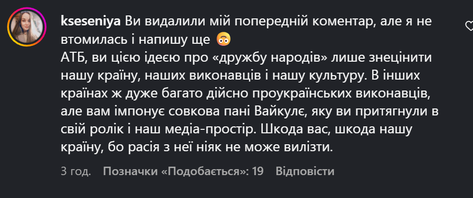 Мы признаем, что в контексте сегодняшней реальности любые публичные фигуры могут восприниматься неоднозначно, и сожалеем, если это вызвало негативные эмоции. С другой стороны, мы еще раз подчеркиваем, что АТБ-маркет не поддерживает и не сотрудничает с лицами, которые имеют пророссийские или антиукраинские позиции. Мы всегда были и остаемся украинским бизнесом, работающим для украинцев и вместе с украинцами, а украинская идентичность и культура – основа всех наших коммуникаций,