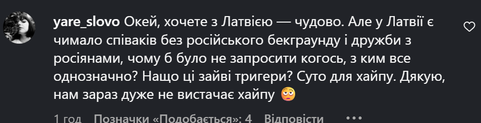 - "В Латвии есть немало певцов без российского бэкграунда и дружбы с россиянами, почему бы было не пригласить кого-то, с кем все однозначно? Зачем эти лишние триггеры? Чисто для хайпа".