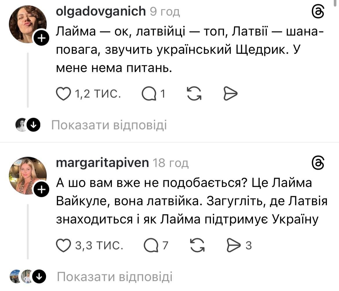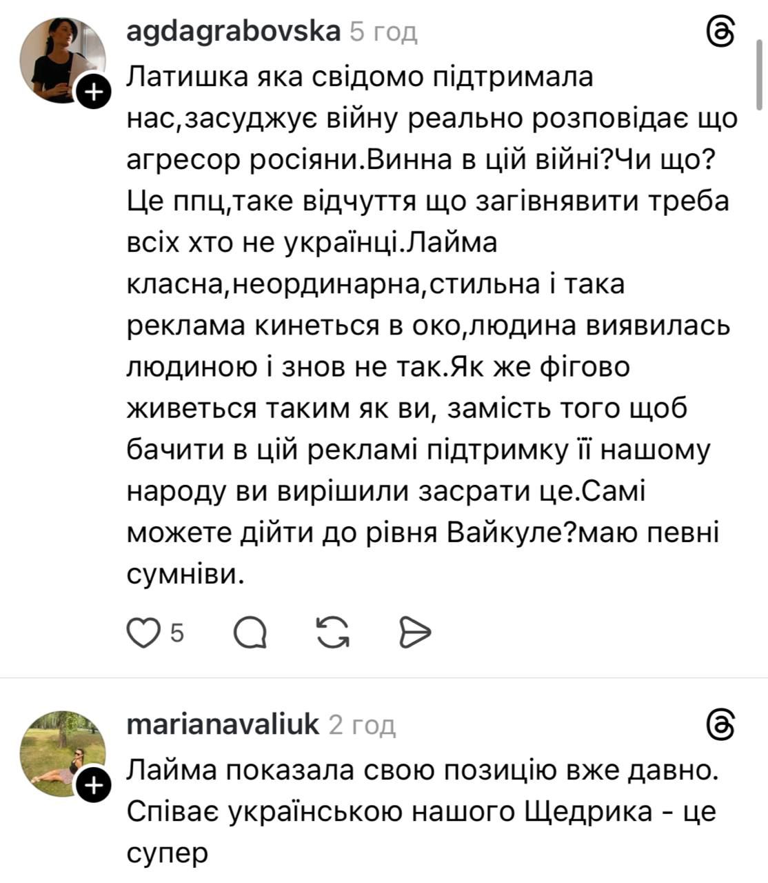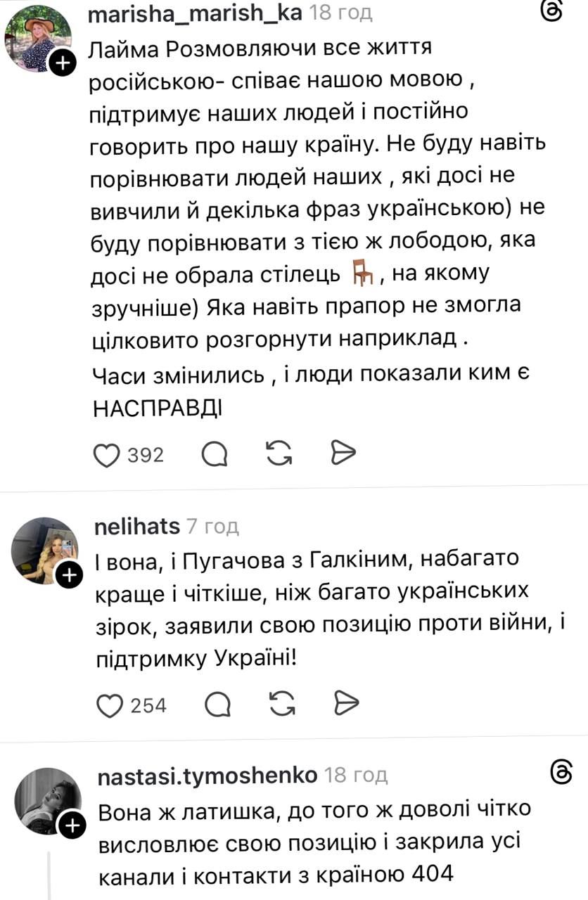 В то же время есть и те пользователи, которые защищают Лайму Вайкуле, отмечая, что она латвийка, которая четко выразила позицию против войны, поддерживает Украину и поет на украинском.