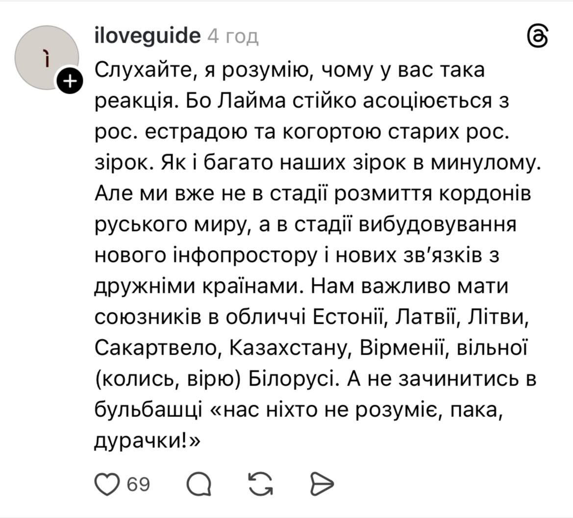 - "Слушайте, я понимаю, почему у вас такая реакция. Потому что Лайма устойчиво ассоциируется с российской эстрадой и когортой старых российских звезд – как и многие наши звезды в прошлом. Но мы уже не в стадии размытия границ "русского мира", а в процессе выстраивания нового инфопространства и новых связей с дружественными странами. Нам важно иметь союзников в лице Эстонии, Латвии, Литвы, Сакартвело, Казахстана, Армении, свободной Беларуси, а не закрываться в пузыре: "Нас никто не понимает, пака, дурачки!"".