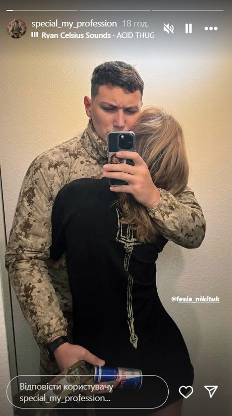 Так, жених Леси Никитюк выставил сторис. На фото Дмитрий позирует в военной форме, а телезвезда – в патриотической футболке с трезубцем. На снимке пара нежно обнимается.