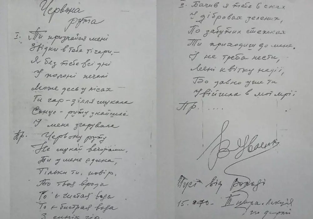 В 1969 году во время перерыва между репетициями оркестра Володя напел мне свою композицию. А потом была обычная лекция, на которой он протянул мне лист с текстом "Червоной руты". Внизу – подпись: "Мусі від Володі. III пара по дермі..." – Этот лист бумаги храню до сих пор. Дорогие сердцу слова, написаны рукой Володи,