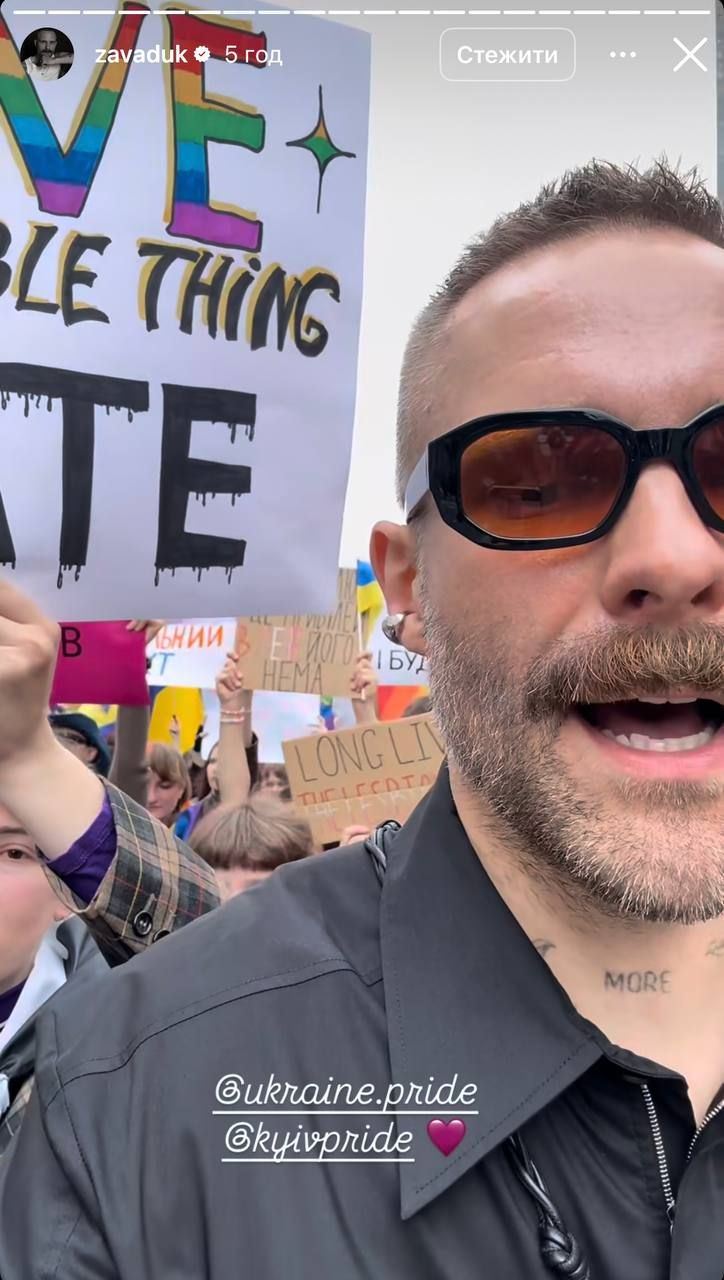Марш равенства поддержал продюсер Владимир Завадюк, который ранее совершил каминг-аут. Он прошелся по улицам столицы и вместе с другими участниками выкрикивал различные лозунги, в частности "Имеем право на любовь и на свободное существование".