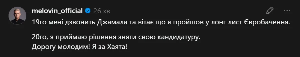 В то же время он снял свою кандидатуру. Певец впервые объяснил, почему принял такое решение. Пишет 24 Канал со ссылкой на страницу MELOVIN в Threads.