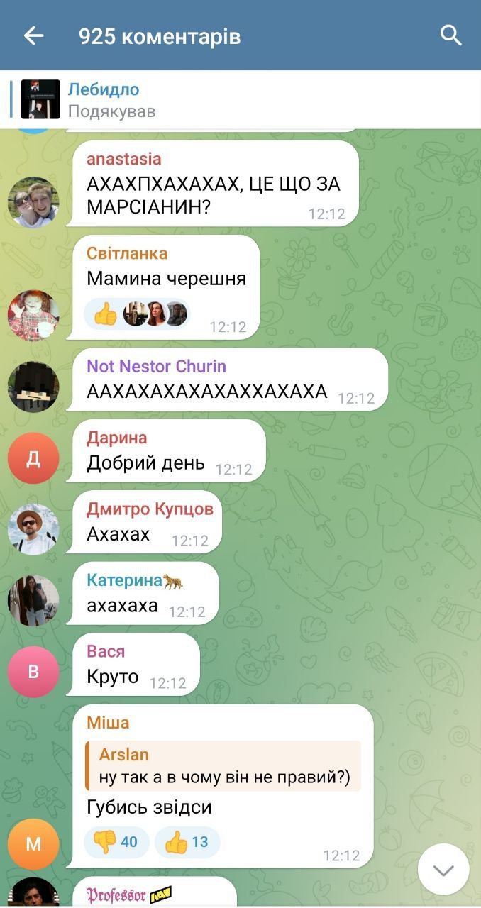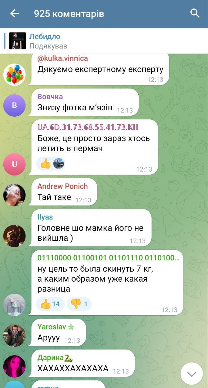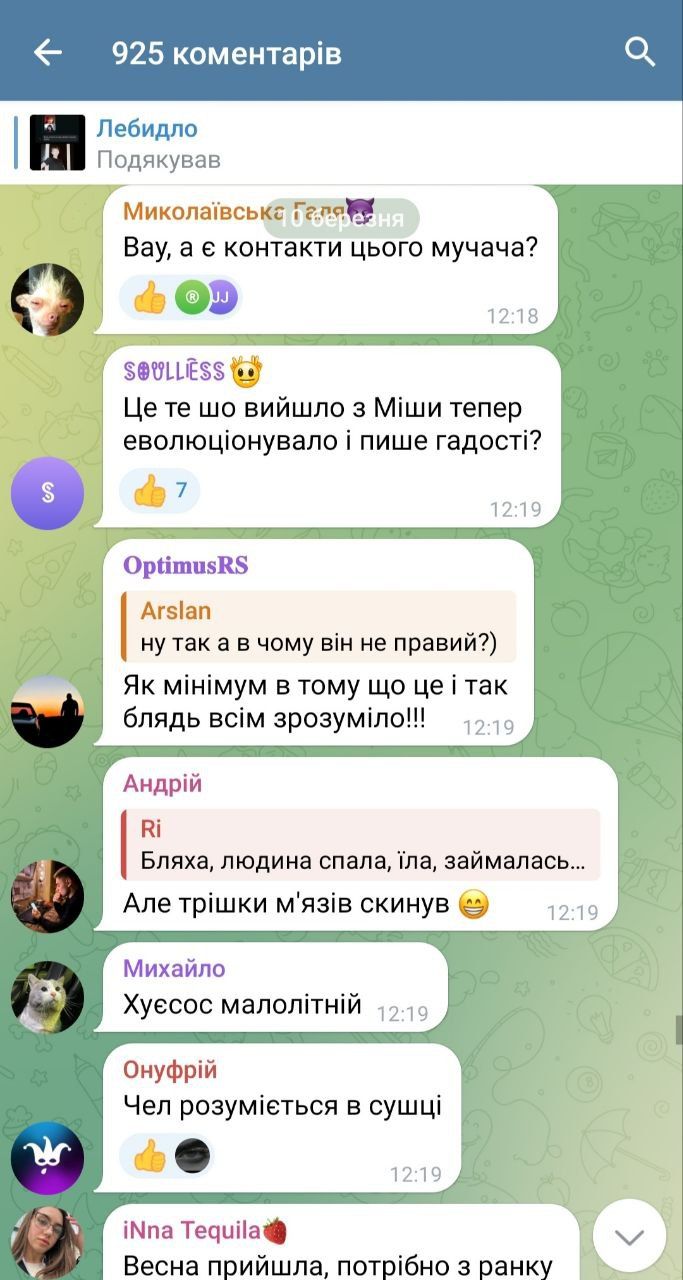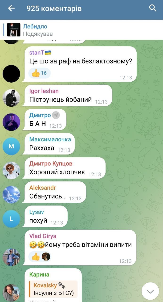 Комментарии под сообщением Лебиги / Скриншоты из телеграм-канала блогера: