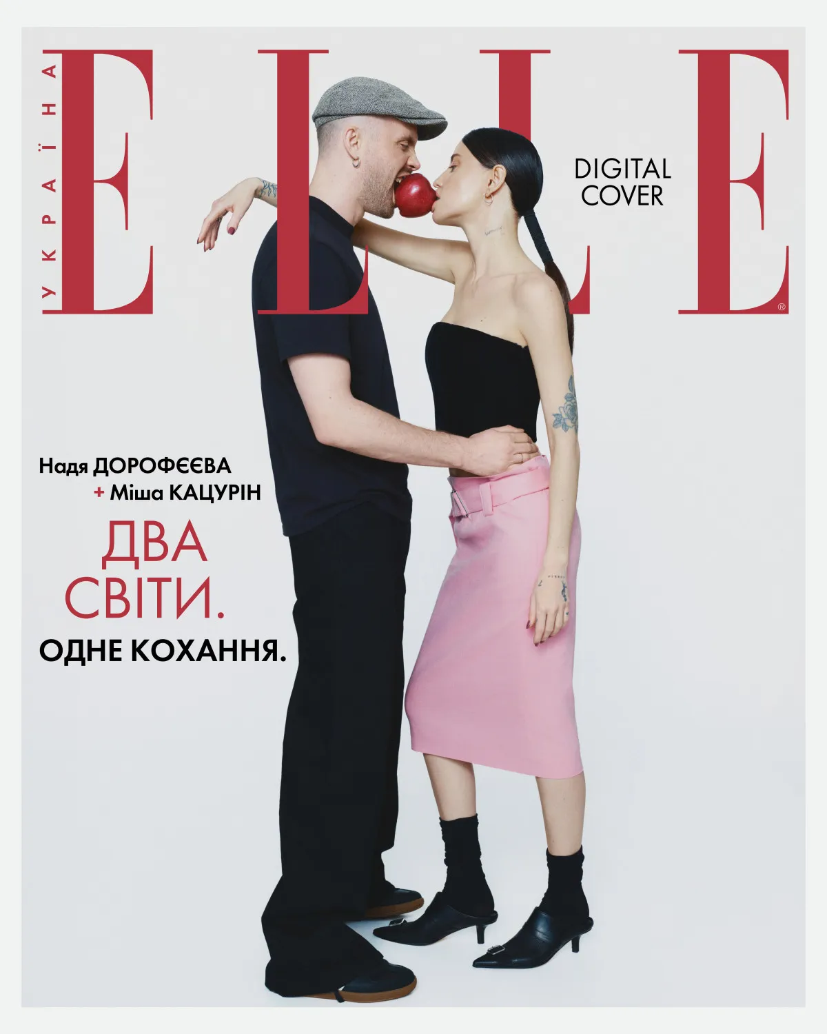 Надя Дорофеева и Миша Кацурин сменили несколько образов для фотосессии. На одной из обложек певица позировала в черном топе без бретелек, сочетающийся с высокими носками и сандалиях в том же оттенке, а также розовой юбке миди с широким поясом в цвете baby pink.