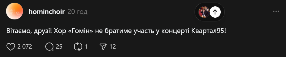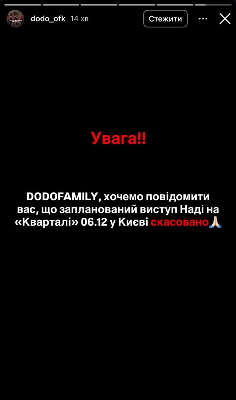 Так, хор "Гомон", KOLA и Надя Дорофеева заявили, что не будут выступать 6 и 7 декабря во дворце "Украина", о чем сообщили в инстаграме и Threads.