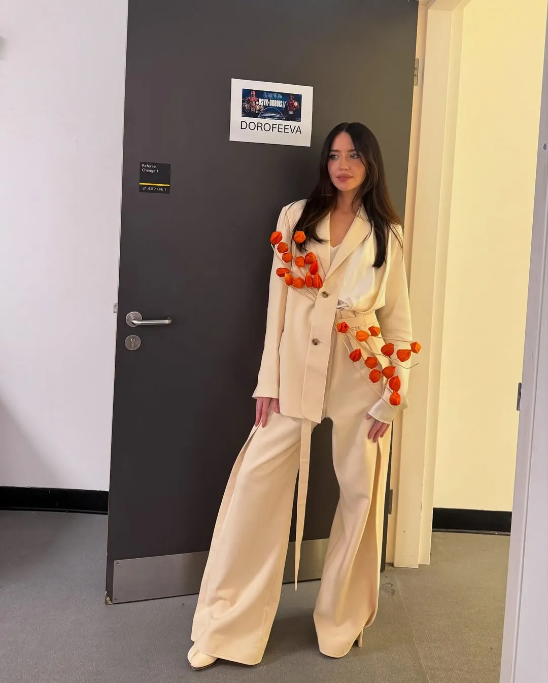 Исполнительница выбрала костюм молочного от украинского дизайнера Лилии Литковской (LITKOVSKA). Это широкие брюки с высокой посадкой и поясом и элегантный жакет с разрезом, украшенный ветвью физалиса.