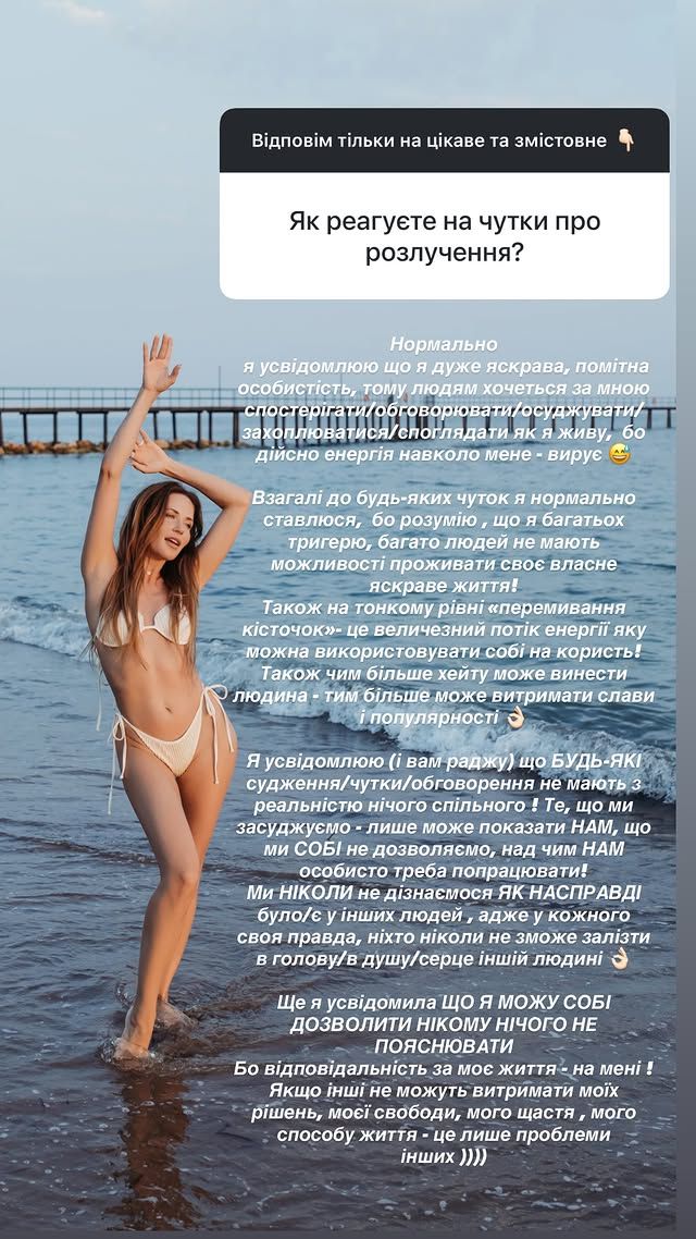 "Я осознаю (и вам советую), что любые суждения, слухи, обсуждения не имеют с реальностью ничего общего! Мы никогда не узнаем, как на самом деле было или есть у других людей, ведь у каждого своя правда, никто никогда не сможет залезть в голову, душу, сердце другому человеку", – заметила знаменитость.