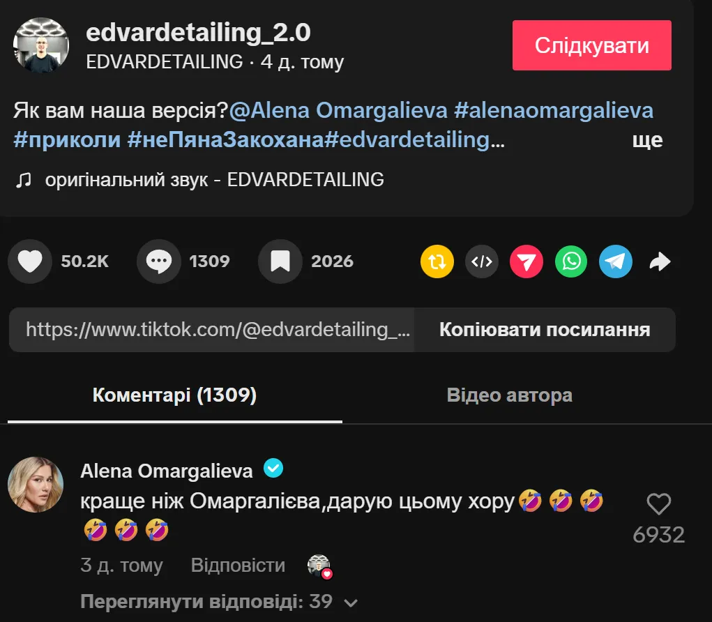 Этот ролик на тик-ток аккаунте edvardetailing_2.0 за четыре дня собрал почти миллион просмотров. Даже сама певица прокомментировала видео: "Лучше чем Омаргалиева".