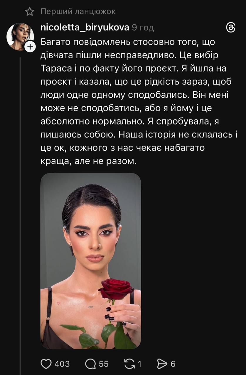 Николетта Бирюкова прокомментировала решение "Холостяка" попрощаться с ней / Скриншот с Threads
