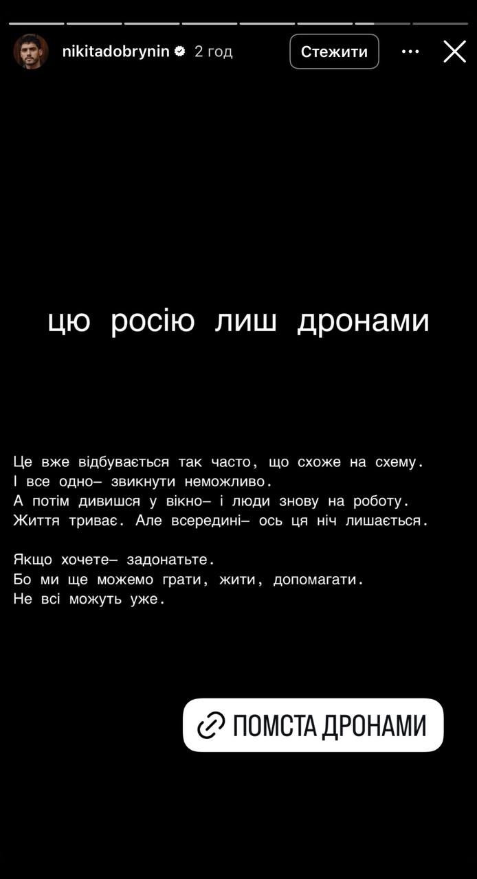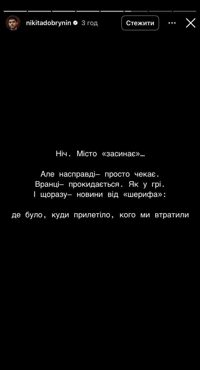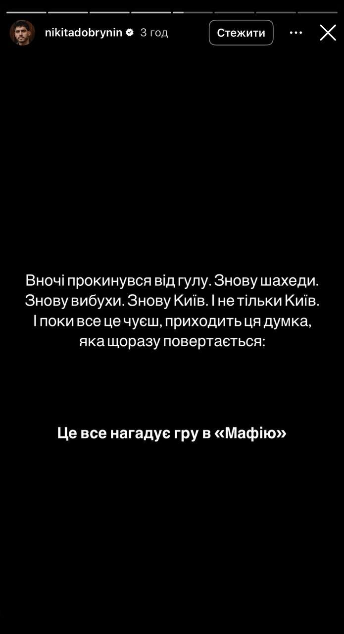 "Ночью проснулся от гула. Опять "Шахеды". Опять взрывы. Опять Киев. И не только Киев. И пока все это слышишь, приходит эта мысль, которая каждый раз возвращается: это все напоминает игру в "Мафию"", – поделился Никита Добрынин.