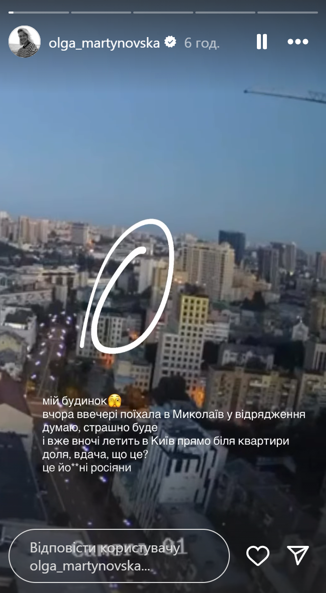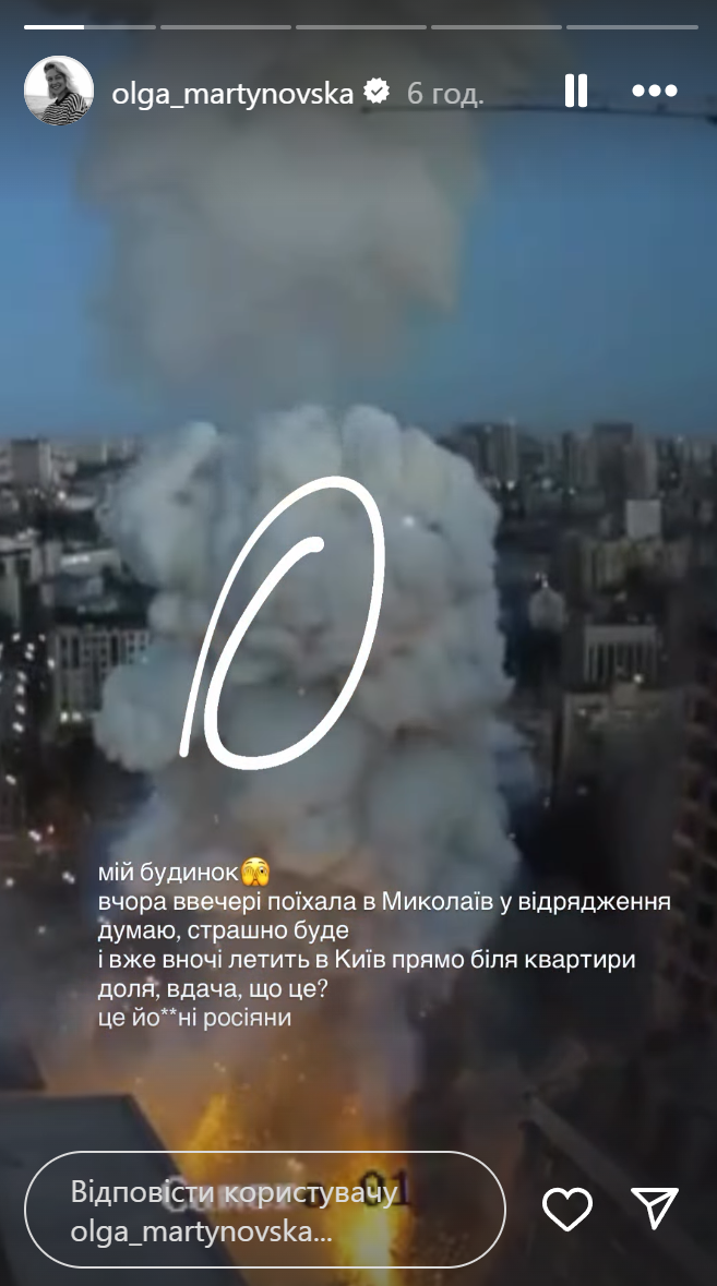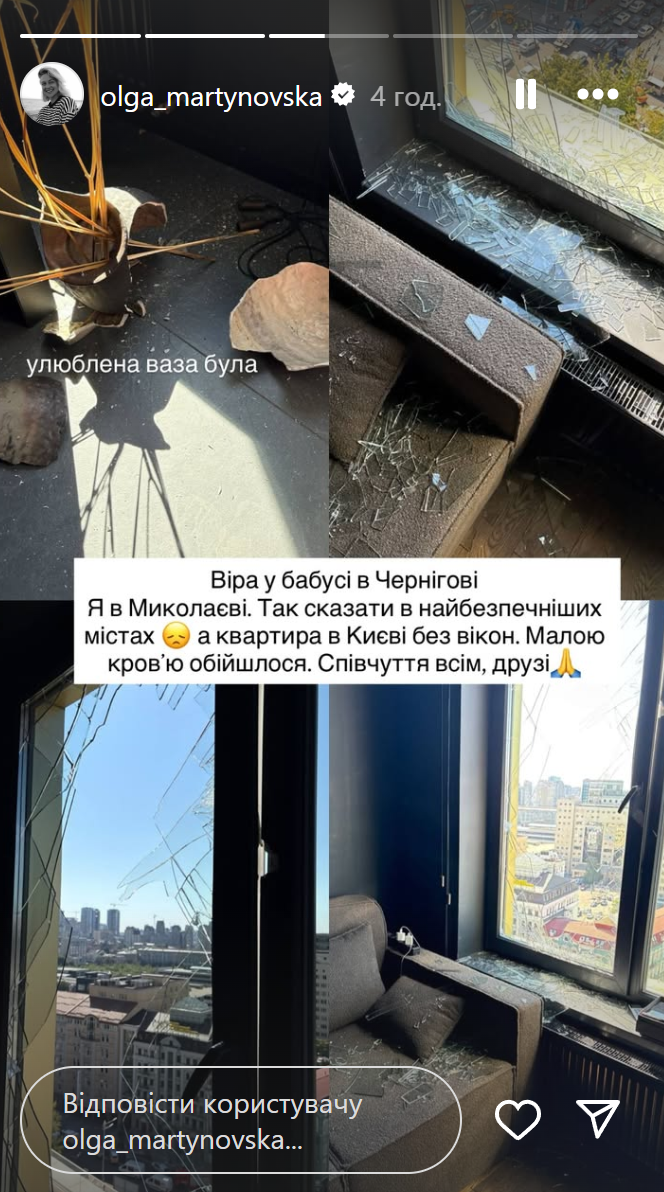 Квартира Ольги Мартыновской пострадала от обстрела Киева / Скриншот из инстаграм-сторис