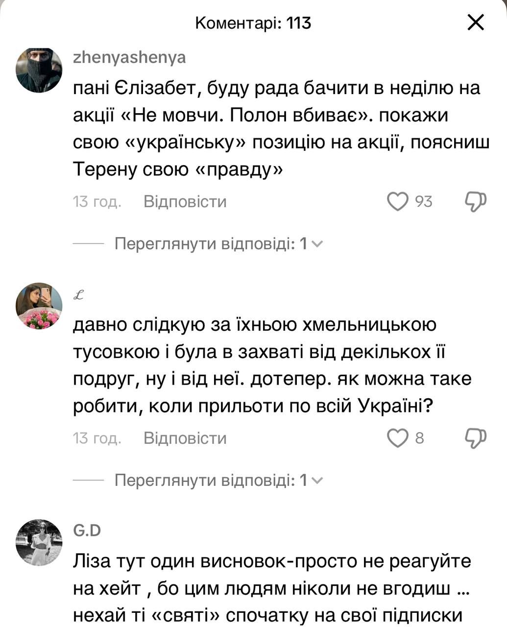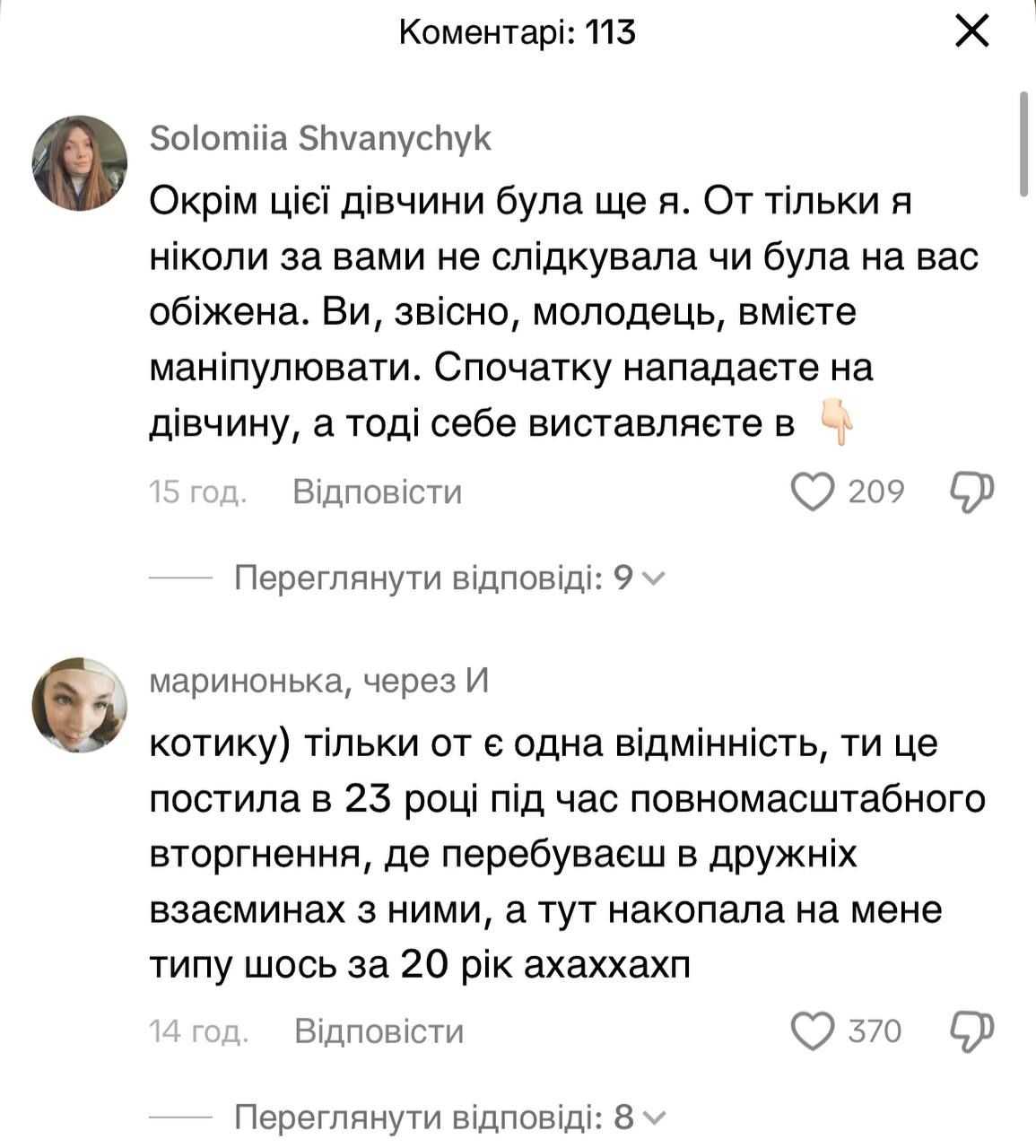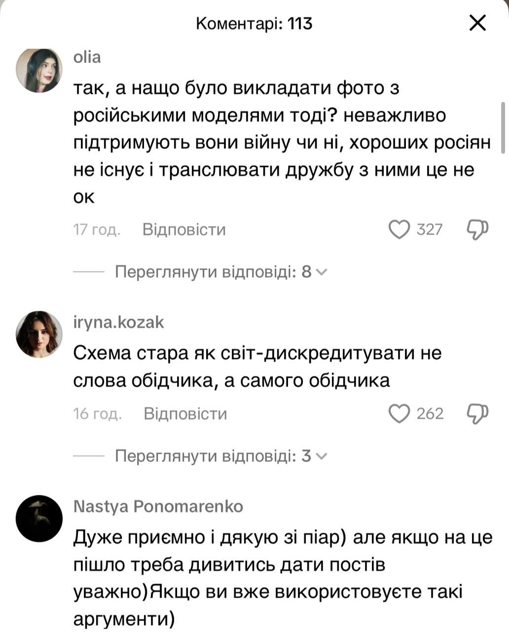 Елизавета Луцюк также обвинила в лицемерии девушку, которая и распространила в сети ее фото с россиянами. Модель упрекнула ее в "манипуляциях болью украинцев", создании музыки на русском языке и участие в коллективе, тренер которого в 2022 году якобы хвалил российских хореографов.