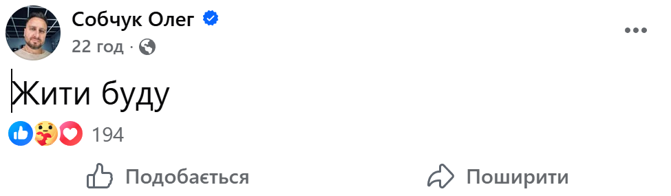 Олег Собчук написал в соцсети лаконичный комментарий "Жить буду".