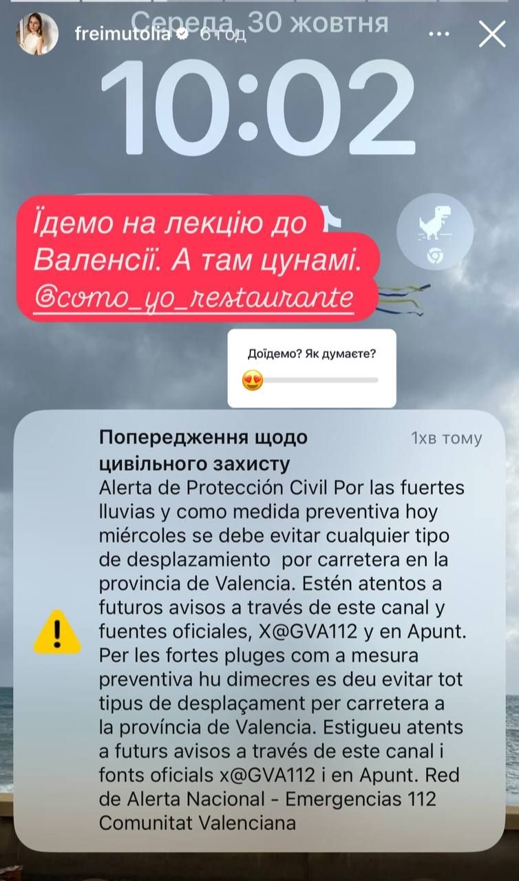 Так, по дороге в Валенсию Фреймут получила предупреждение от службы безопасности, но все равно отправилась на лекцию. Во время поездки она увидела на дорогах заброшенные машины и то, как спасатели вытаскивали людей из машин.