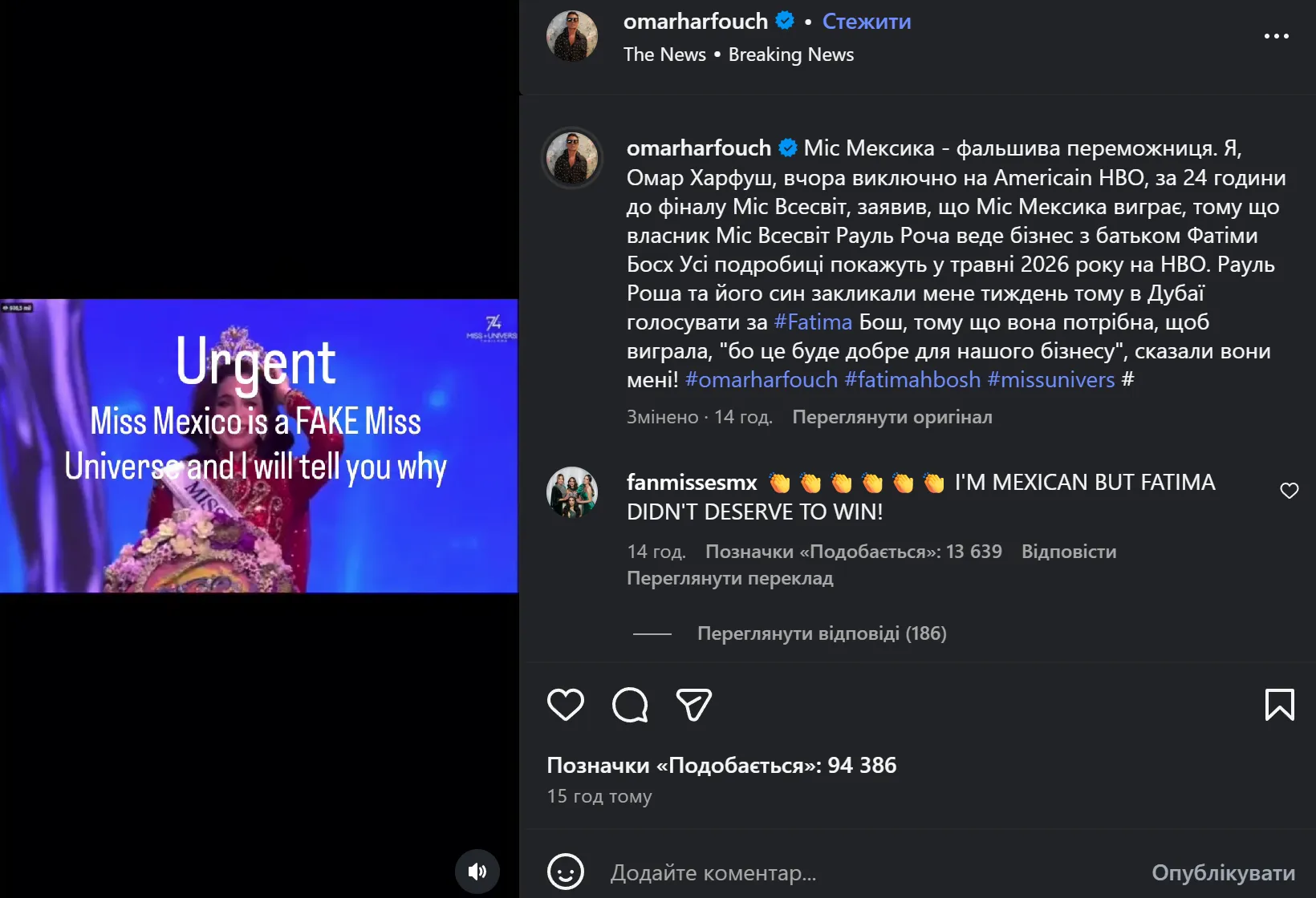 Позже Омар Арфуш опубликовал еще один пост, где написал, что "Мисс Мексика" – фальшивая победительница.