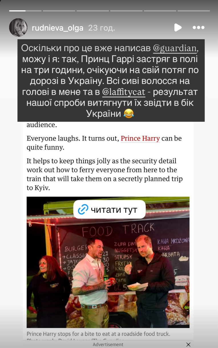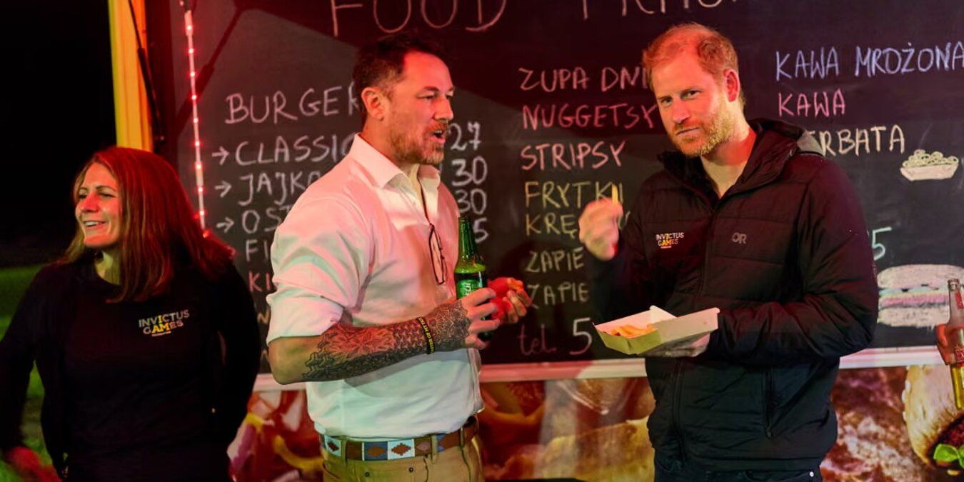 Во время путешествия принц где-то "среди поля" три часа ожидал поезд из Польши в Украину. Они остановились возле придорожного кафе, а команда Фонда Игорь Непокоренных делилась с Гарри чипсами и пивом.
