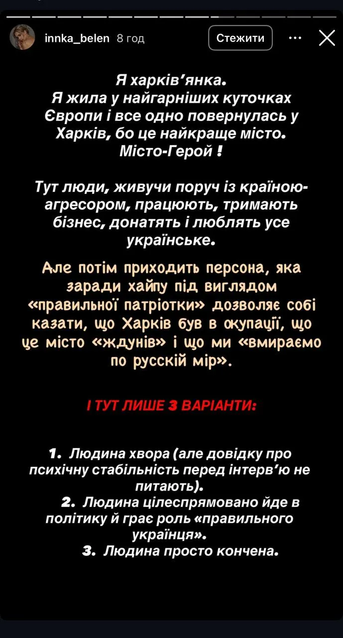 Но потом приходит персона, которая ради хайпа под видом "правильной патриотки" позволяет себе говорить, что Харьков был в оккупации, что это город "ждунов". И здесь только 3 варианта: человек болен (но справку о психической стабильности перед интервью не спрашивают); человек целенаправленно идет в политику и играет роль "правильного украинца"; человек просто конч*ный,