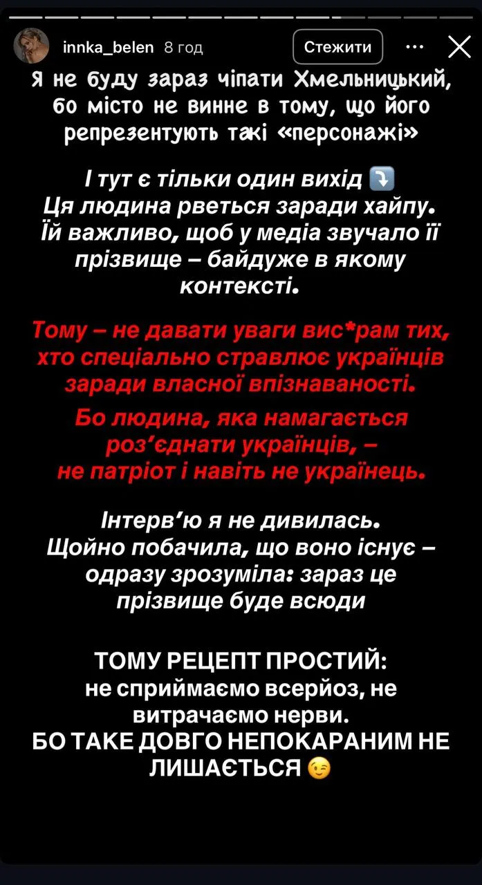 Об этом сообщает Show 24 со ссылкой на инстаграм Белень. Она прокомментировала заявление Мандзюк в сториз.