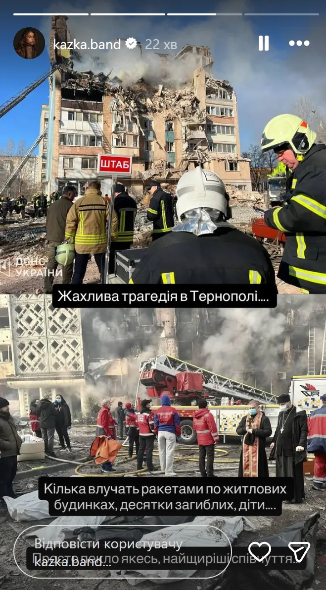 Фронтвумен группы KAZKA поделилась кадрами разрушенного жилого дома в Тернополе в своем инстаграме.
