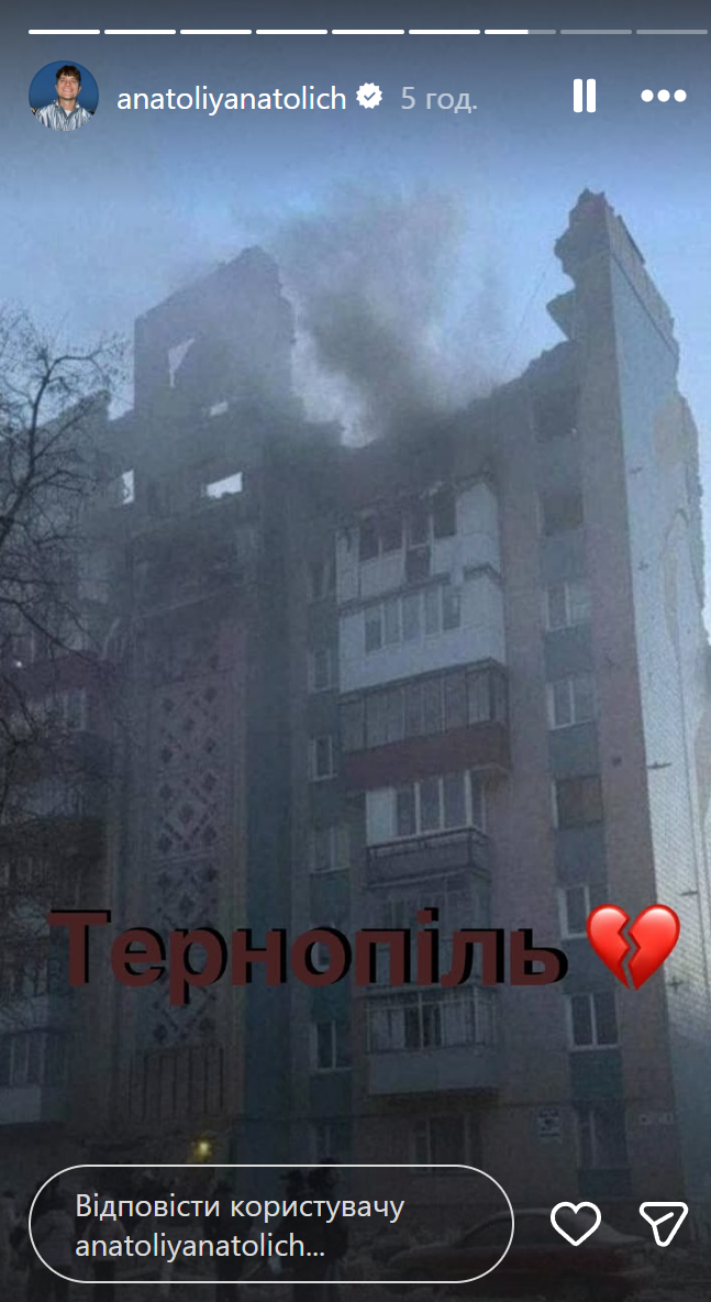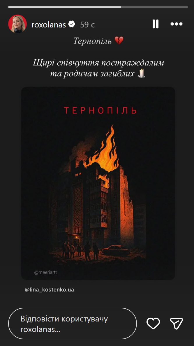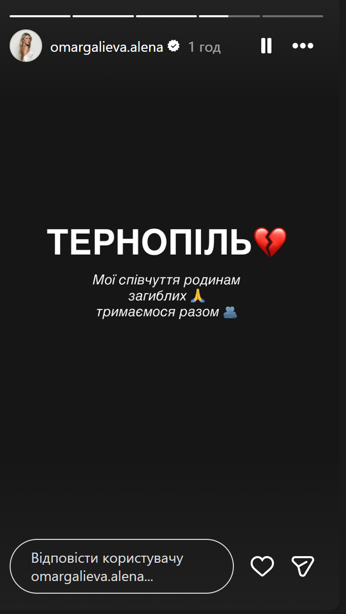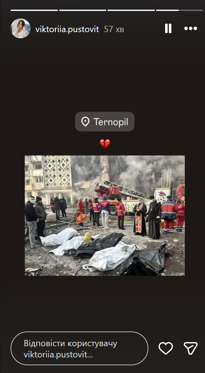 Екатерина Сильченко отреагировала на обстрел Тернополя / Скриншот из инстаграм-сторис