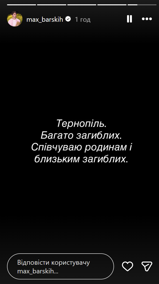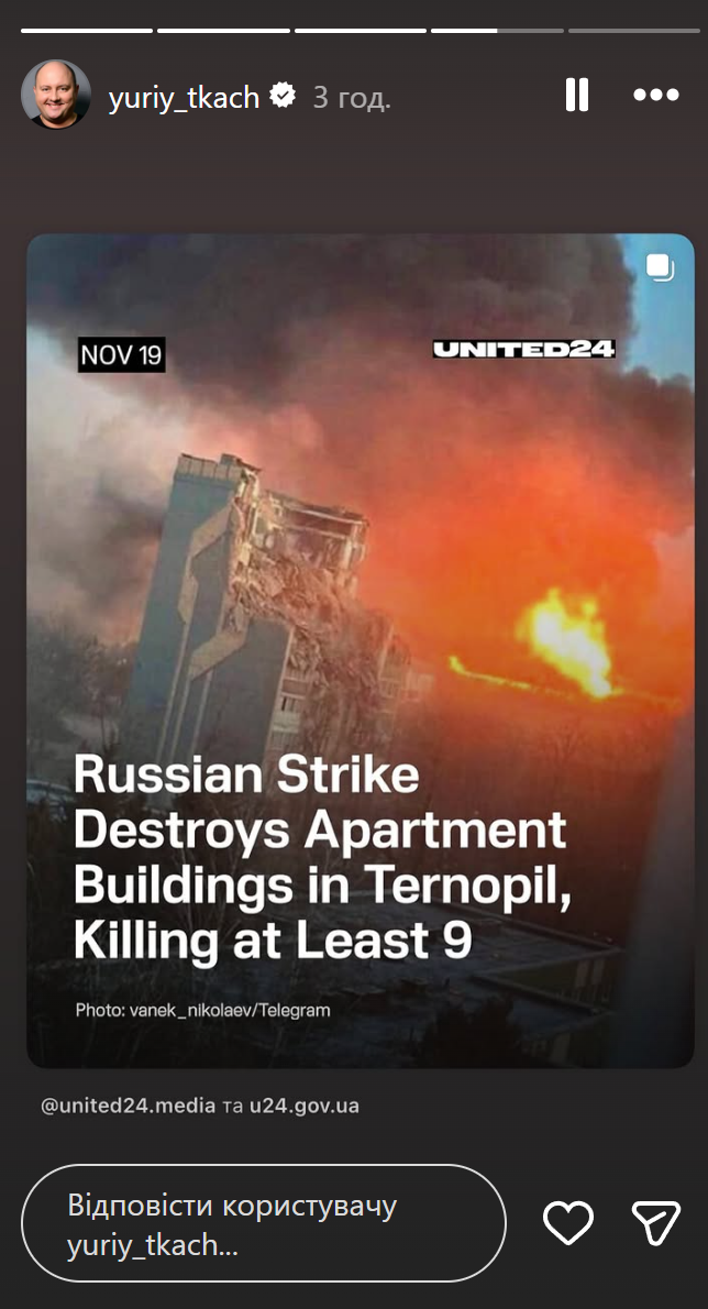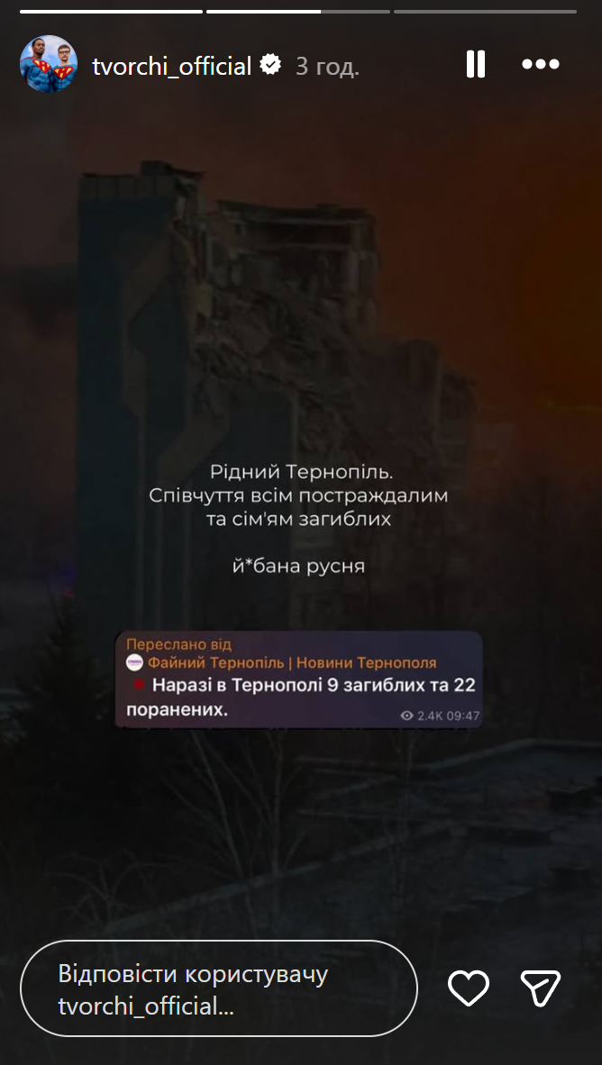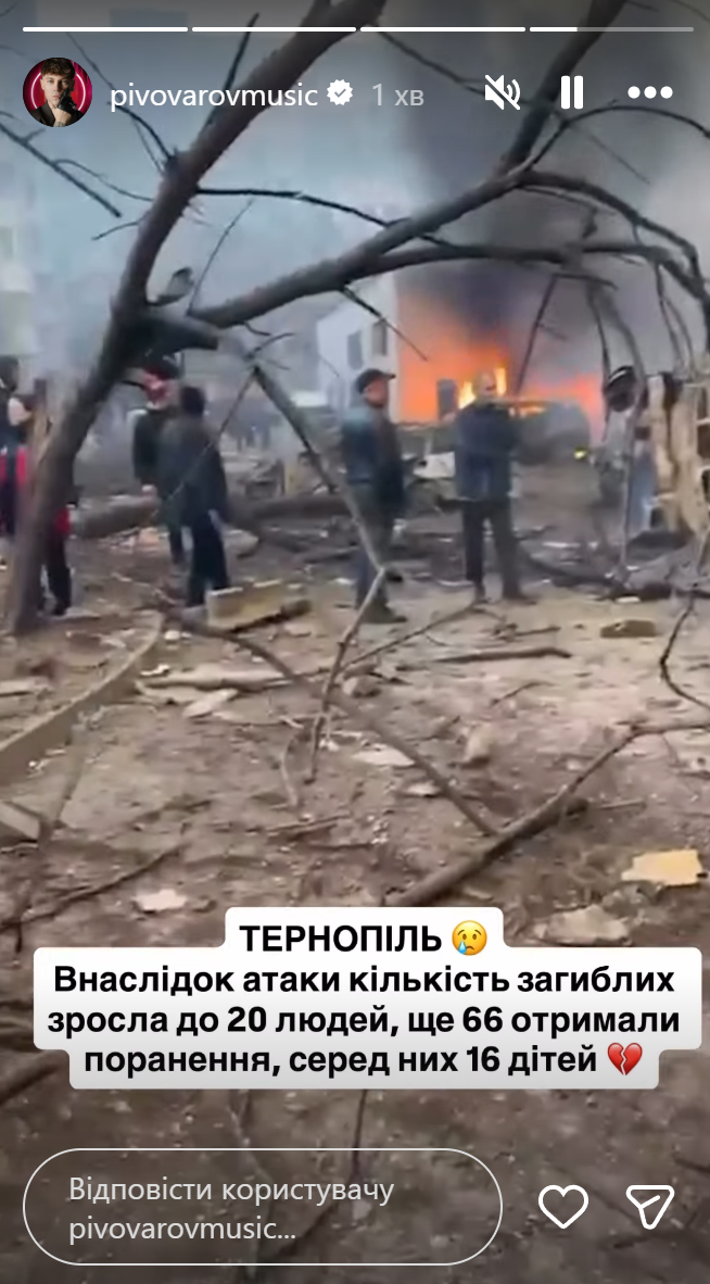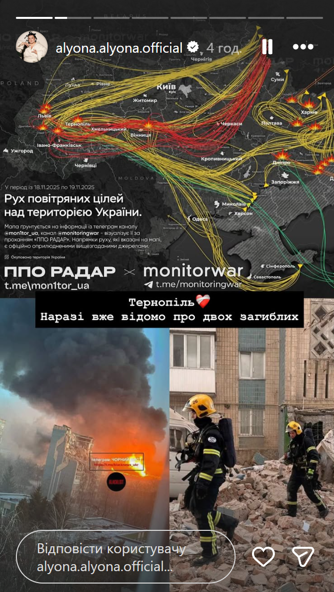 Екатерина Сильченко отреагировала на обстрел Тернополя / Скриншот из инстаграм-сторис
