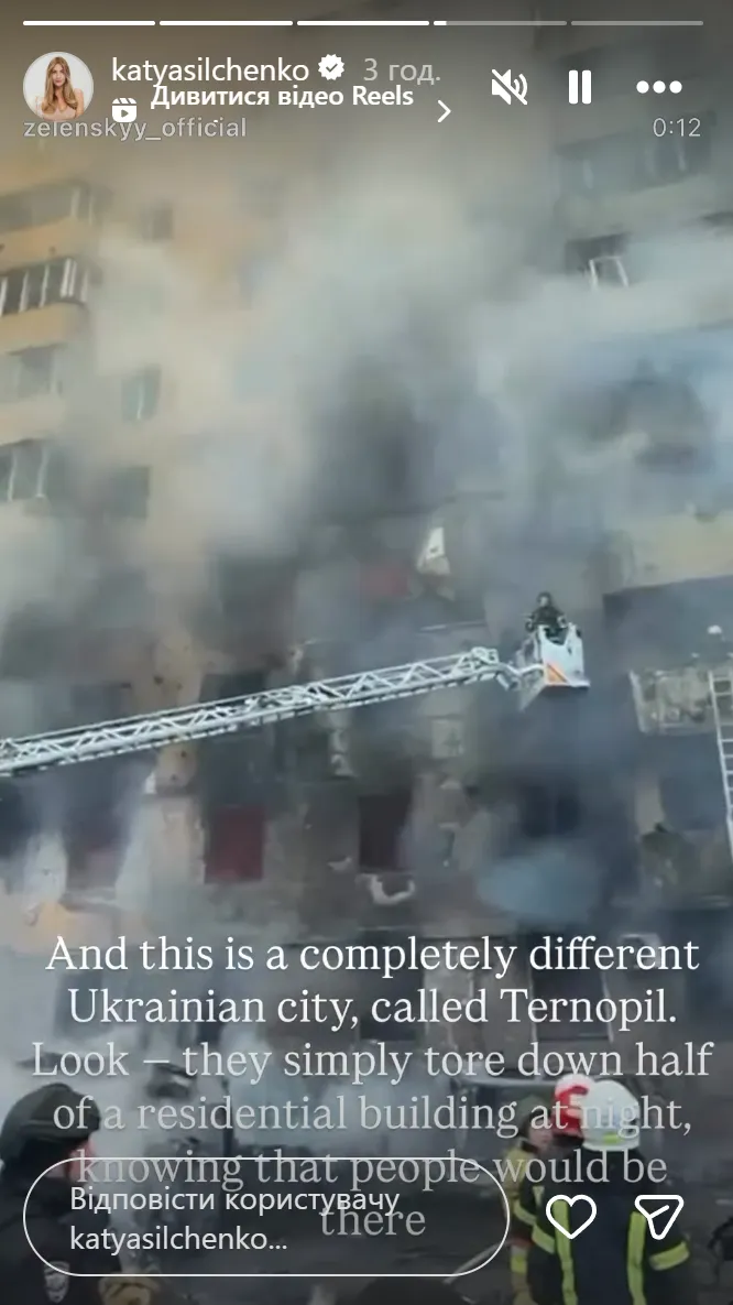 В другой сторис знаменитость добавила: "Посмотрите – они просто снесли половину жилого дома ночью, зная, что там будут люди".