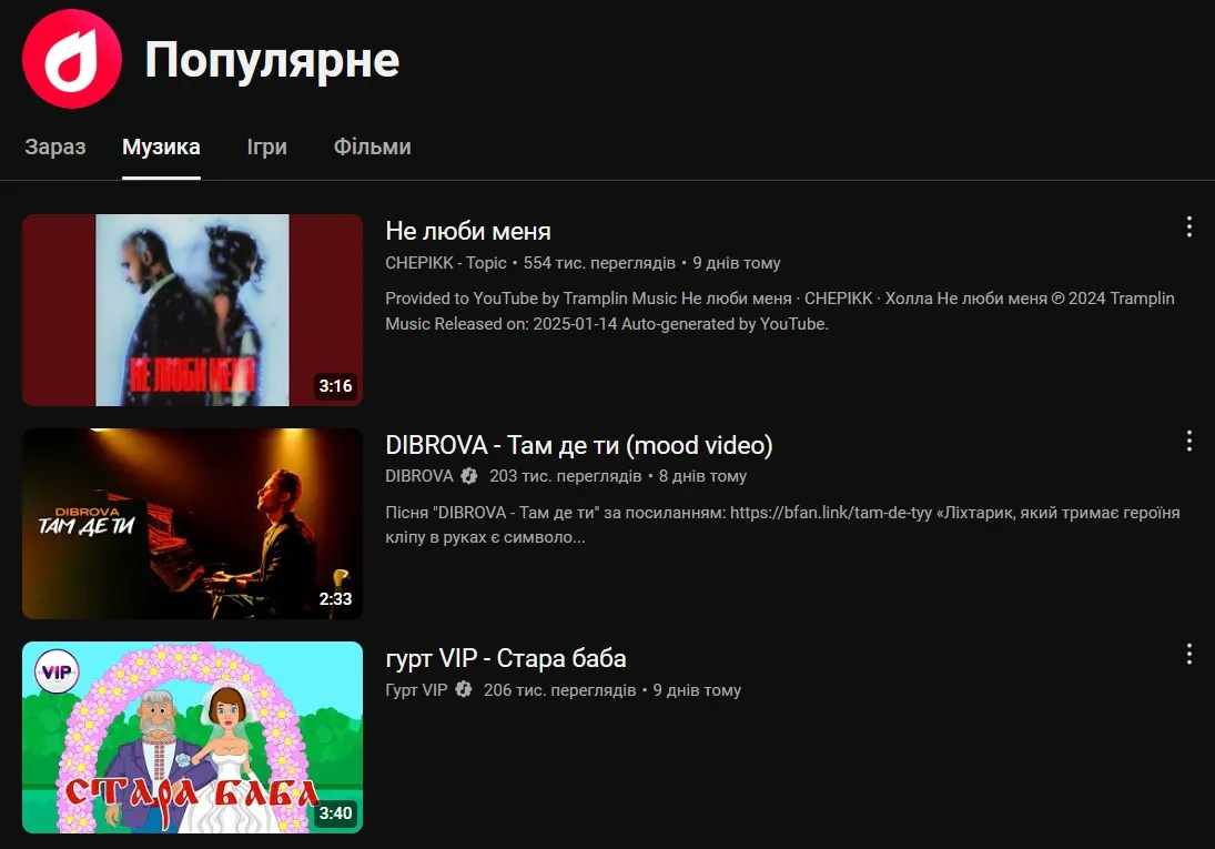 Украинцы продолжают слушать российскую музыку на стриминговых платформах. Об этом передает 24 Канал со ссылкой на чарт "Популярное" на YouTube.