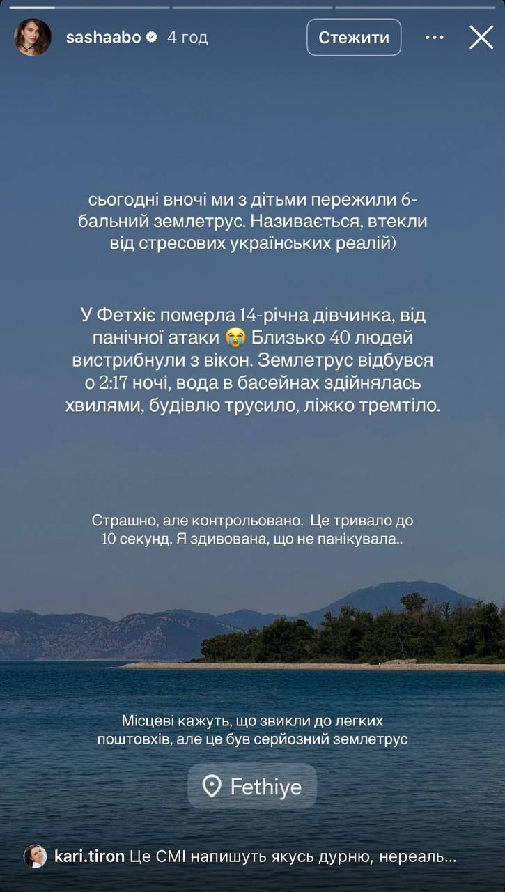 В сториз Саша Бо сообщила, что ночью 3 июня вместе с детьми пережила землетрясение, которое всколыхнуло Турцию. Семья отправилась на отдых, чтобы убежать "от стрессовых украинских реалий".