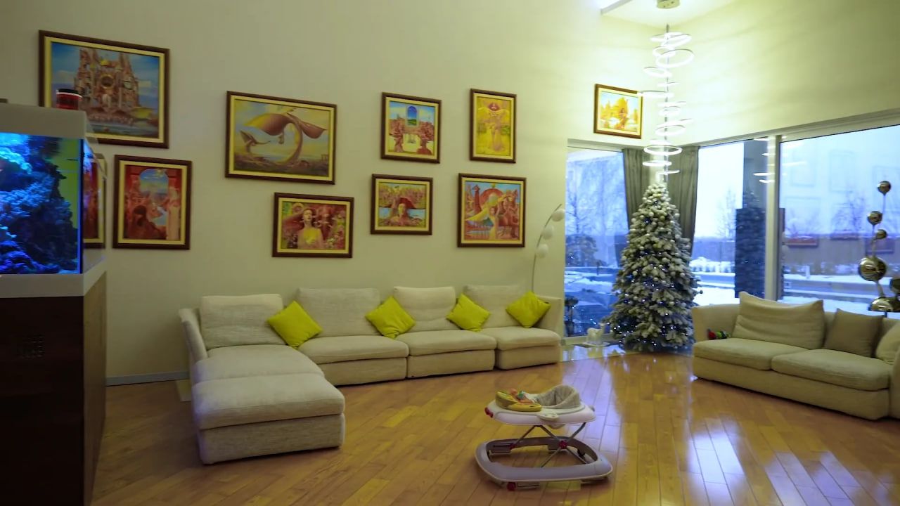 Дорогой аквариум, который стоит 3 тысячи долларов, расположен в большой гостиной. Для отдыха там также стоят диваны и огромный телевизор, а стены украшают различные картины.