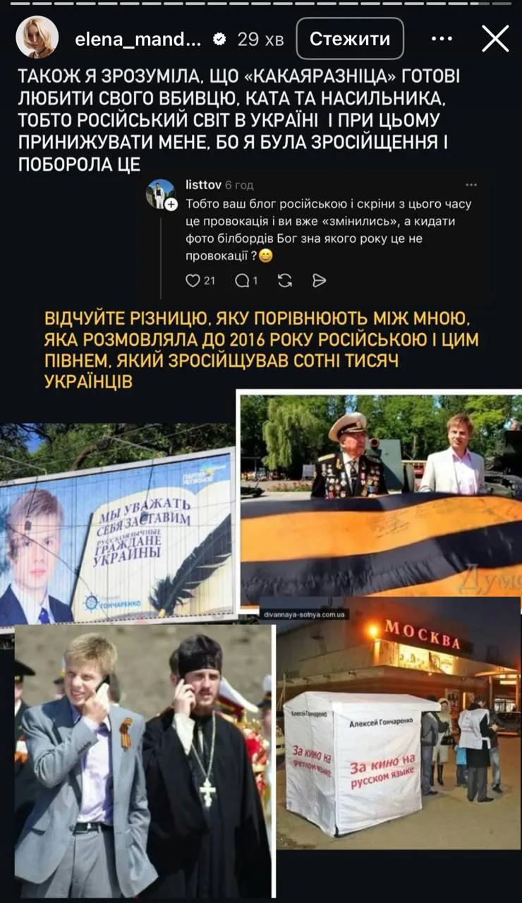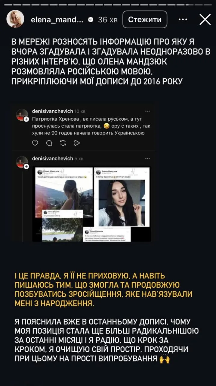 Елена Мандзюк ответила на упреки о том, что была русскоязычной / Скриншоты из соцсетей