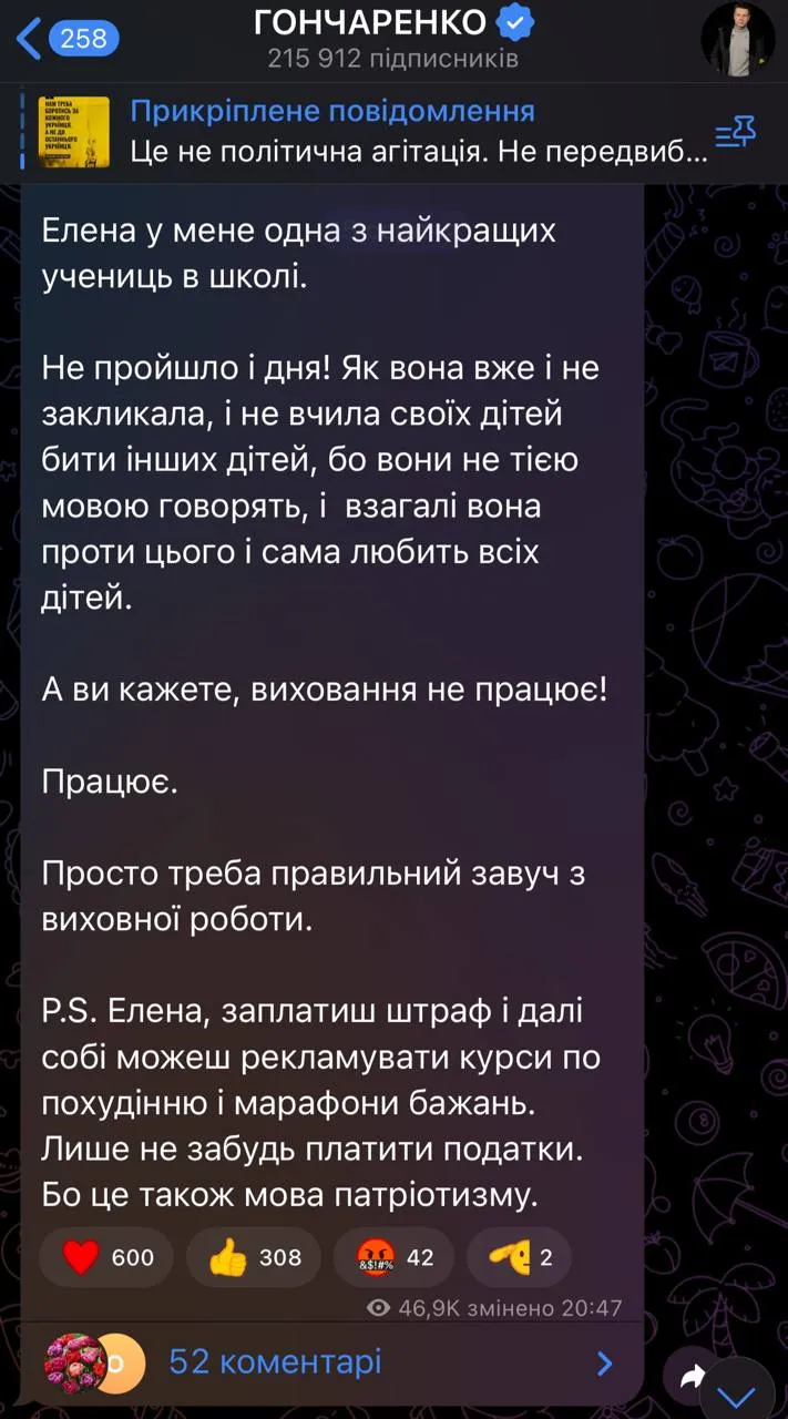 Политик в своем телеграм-канале заявил, что никто не наказывает Мандзюк "за мову", а только за "длинный язык", потому что она якобы призывала бить детей. Также он утверждает, что дело касается и того, что блогер "учит своих детей бить других детей".