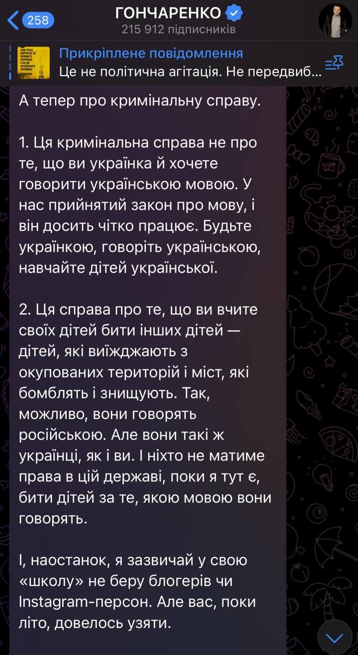 Политик в своем телеграм-канале заявил, что никто не наказывает Мандзюк "за мову", а только за "длинный язык", потому что она якобы призывала бить детей. Также он утверждает, что дело касается и того, что блогер "учит своих детей бить других детей".