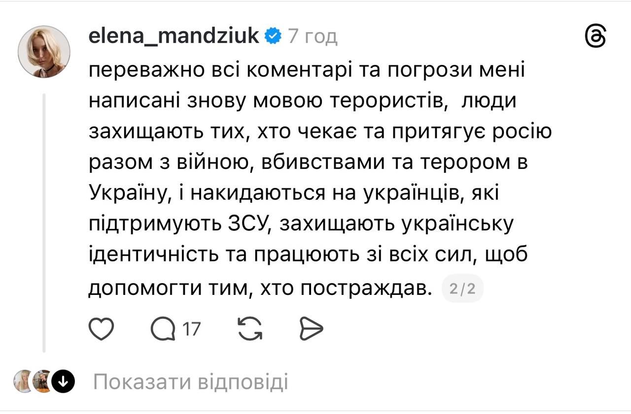 Реакция сети на заявление Елены Мандзюк / Скриншоты с Threads