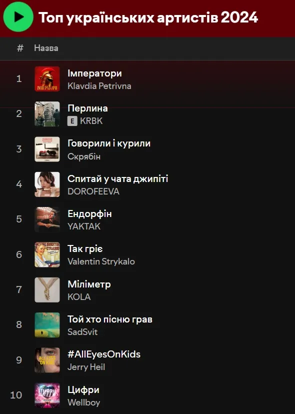 Самой популярной артисткой 2024 года на Spotify оказалась Klavdia Petrivna – ее песни украинцы слушали чаще всего. На втором месте – киевский рэпер KRBK, который выпускает русскоязычные треки во время войны. Один из его треков попал в 10 самых прослушиваемых треков за 2024 год. На третьей строчке – группа "Скрябин".