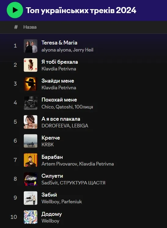 Список самых популярных треков 2024 возглавила песня, которая также стала лидером на Apple Music – Teresa & Maria от alyona alyona, Jerry Heil. С этой композицией артистки представляли Украину на Евровидении.