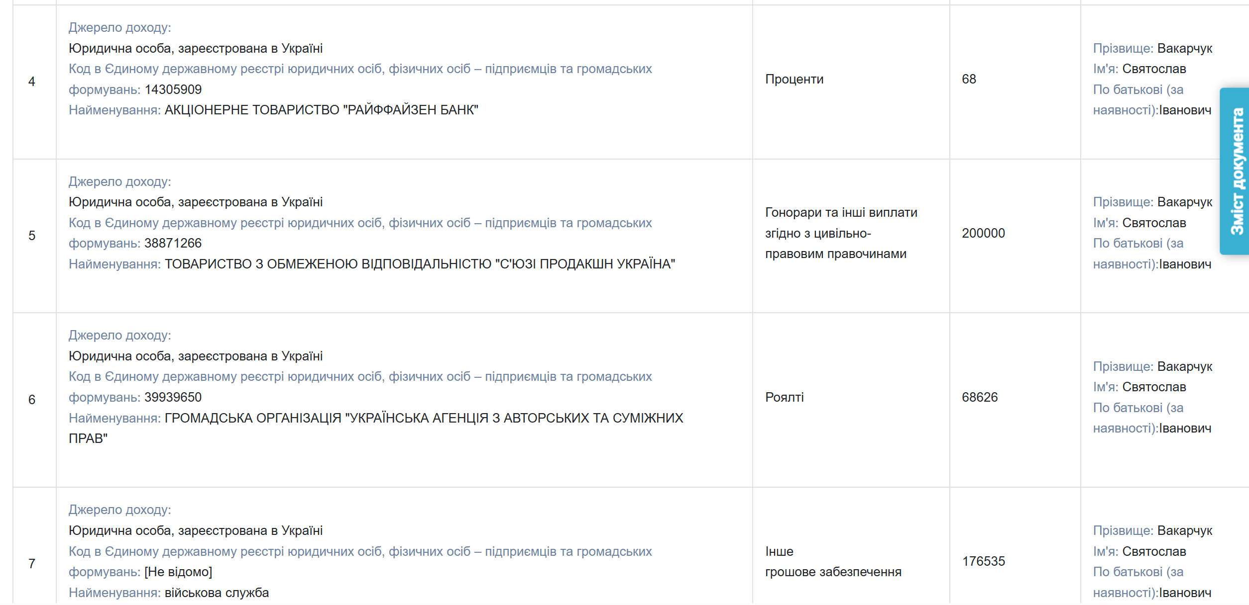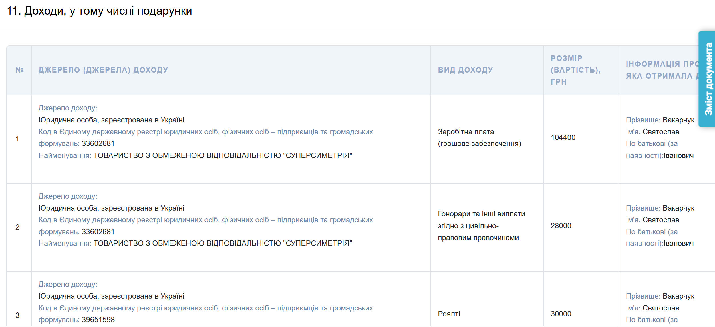 По сравнению с 2023 годом, когда Вакарчук заработал 12,8 миллиона гривен, его доходы уменьшились в более чем десять раз. За 2024 год его доход составил 1 миллион гривен.