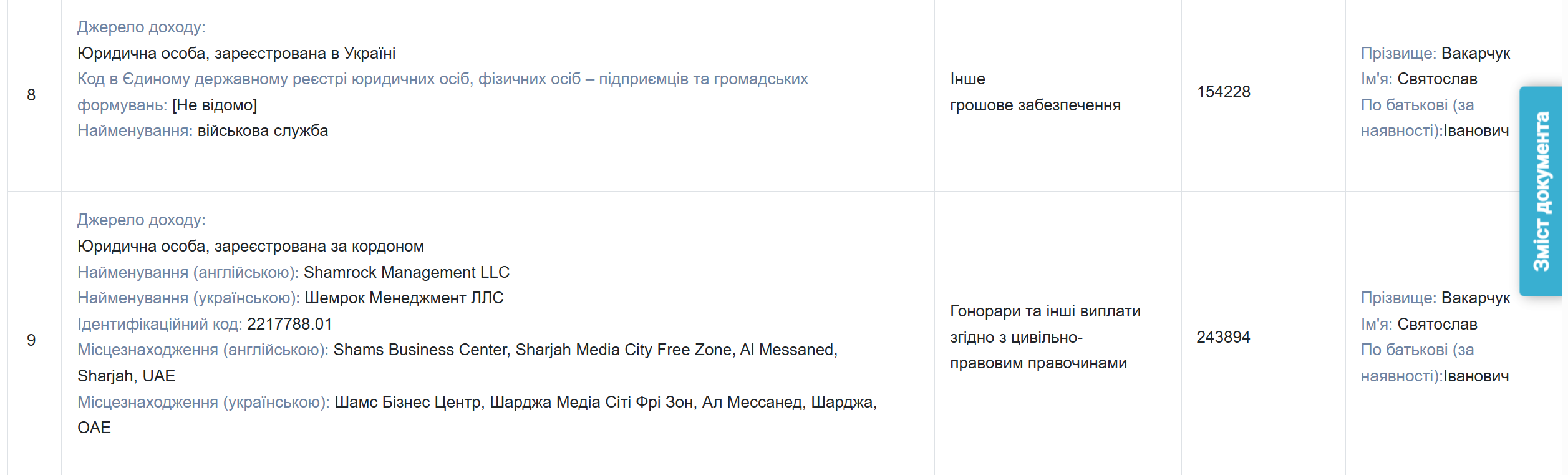 В 2024 году самым прибыльным источником дохода Святослава Вакарчука стала военная служба, которая принесла ему более 330 тысяч гривен. Так, согласно декларации, за военную службу артист получил две выплаты как "другое денежное обеспечение" в размере 176 535 и 154 228 гривен, что суммарно составляет 330 763 гривны.