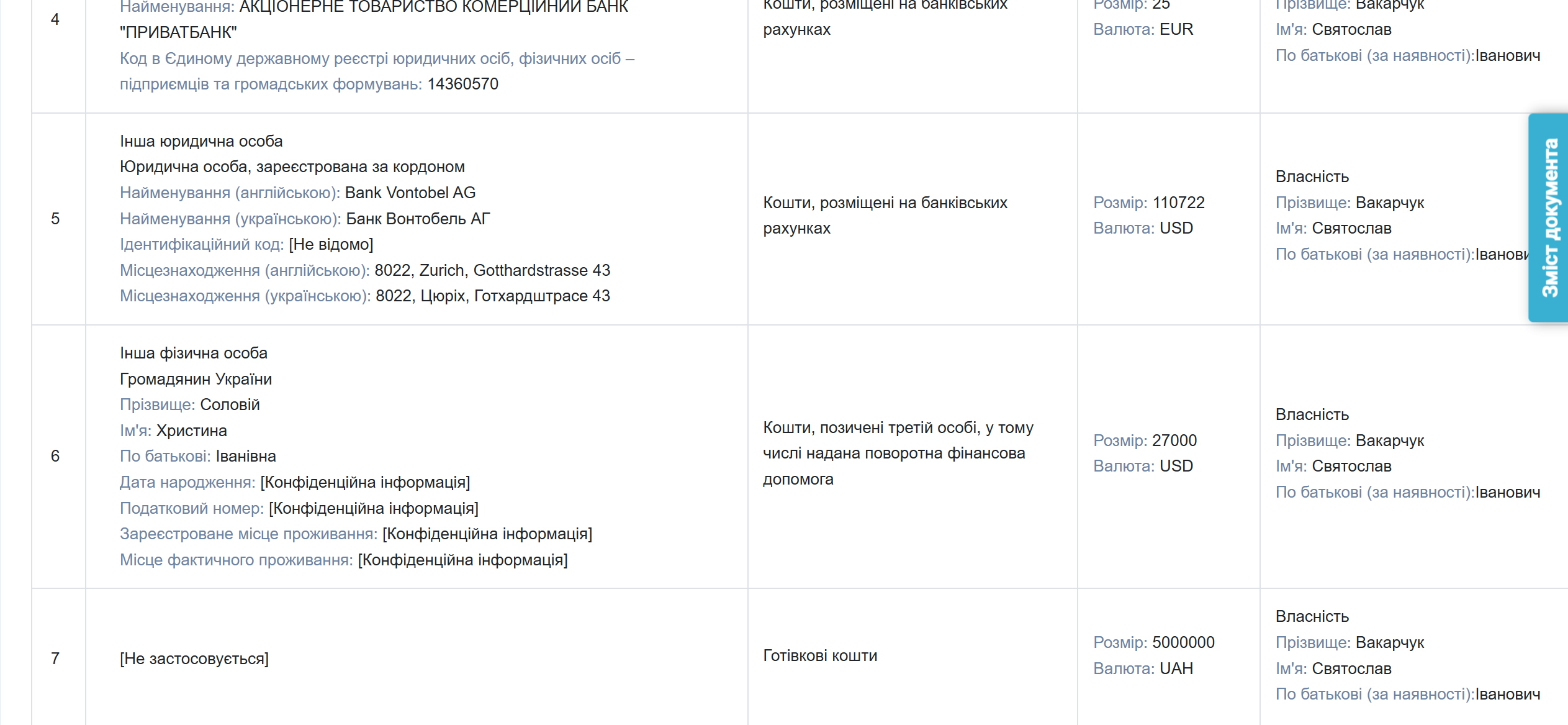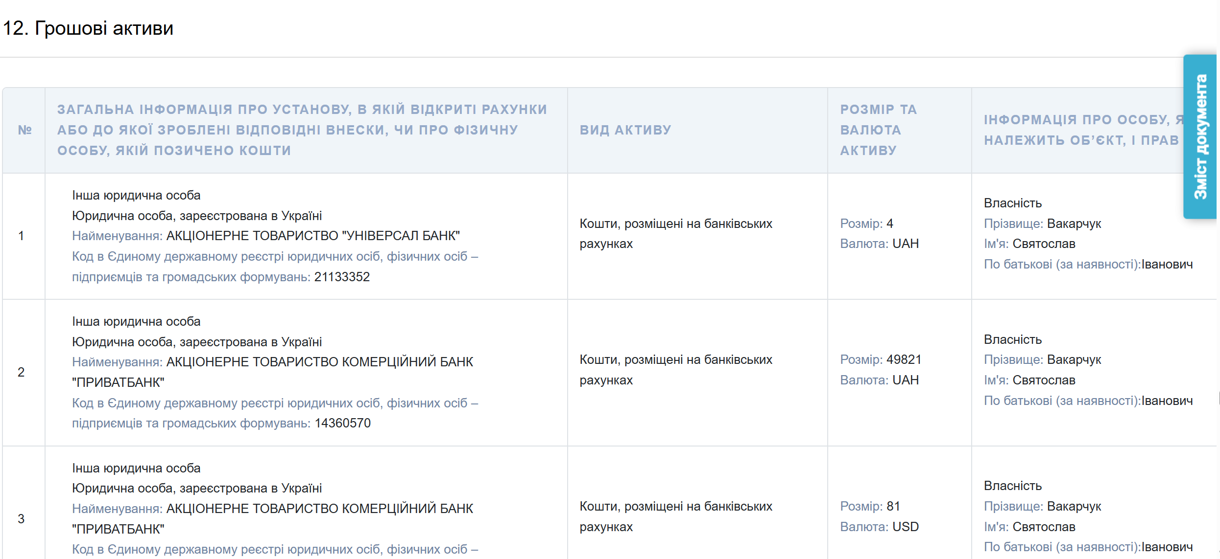 Денежные активы Святослава Вакарчука / Скриншоты из Единого государственного реестра деклараций