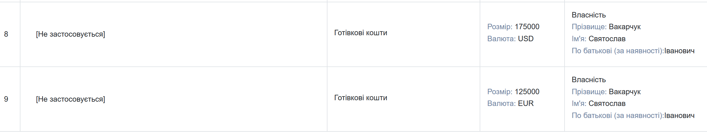 В декларации Вакарчук также указал свои сбережения: 5 миллионов гривен, 175 тысяч долларов и 125 тысяч евро наличными, а также 110 тысяч долларов, 49 тысяч гривен и 25 евро на банковских счетах.