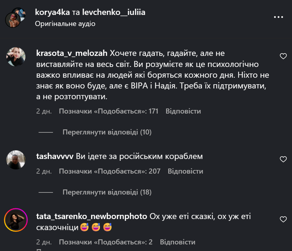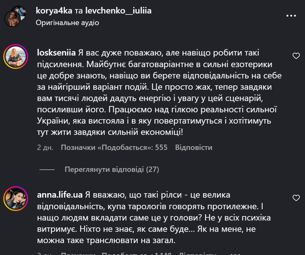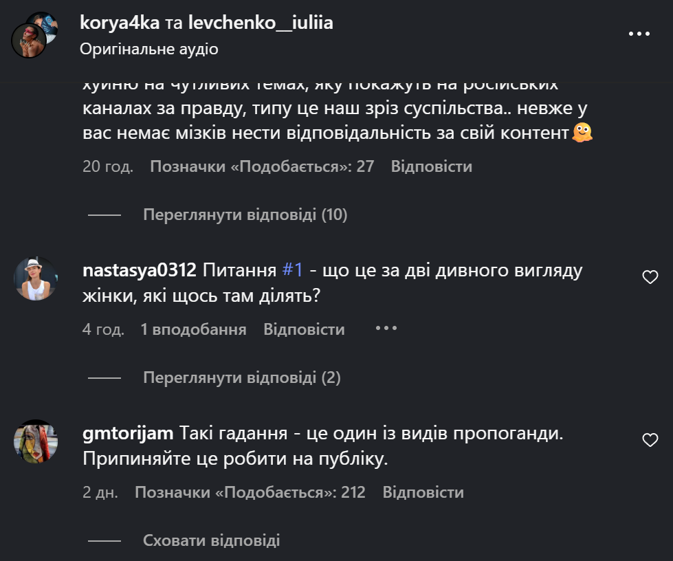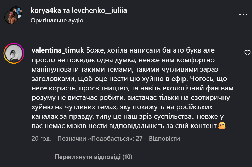 Ролик теперь обсуждают в телеграмме, Threads и других соцсетях. Так, под видео Корячки в инстаграме люди оставили немало негативных комментариев. В частности, пользователи возмутились из-за того, что блогер на многотысячную аудиторию распространяет негативные прогнозы о будущем Украины, которые играют на руку российской пропаганде и подрывают моральный дух украинцев во время войны.