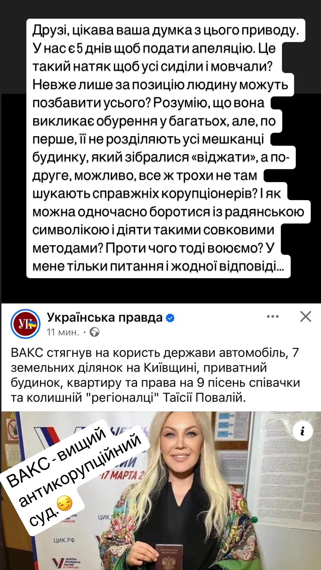 ВАКС (Высший антикоррупционный суд) 23 октября конфисковал у Таисии Повалий ее имущество в пользу государства. На это в инстаграм-сториз отреагировал ее сын Денис.