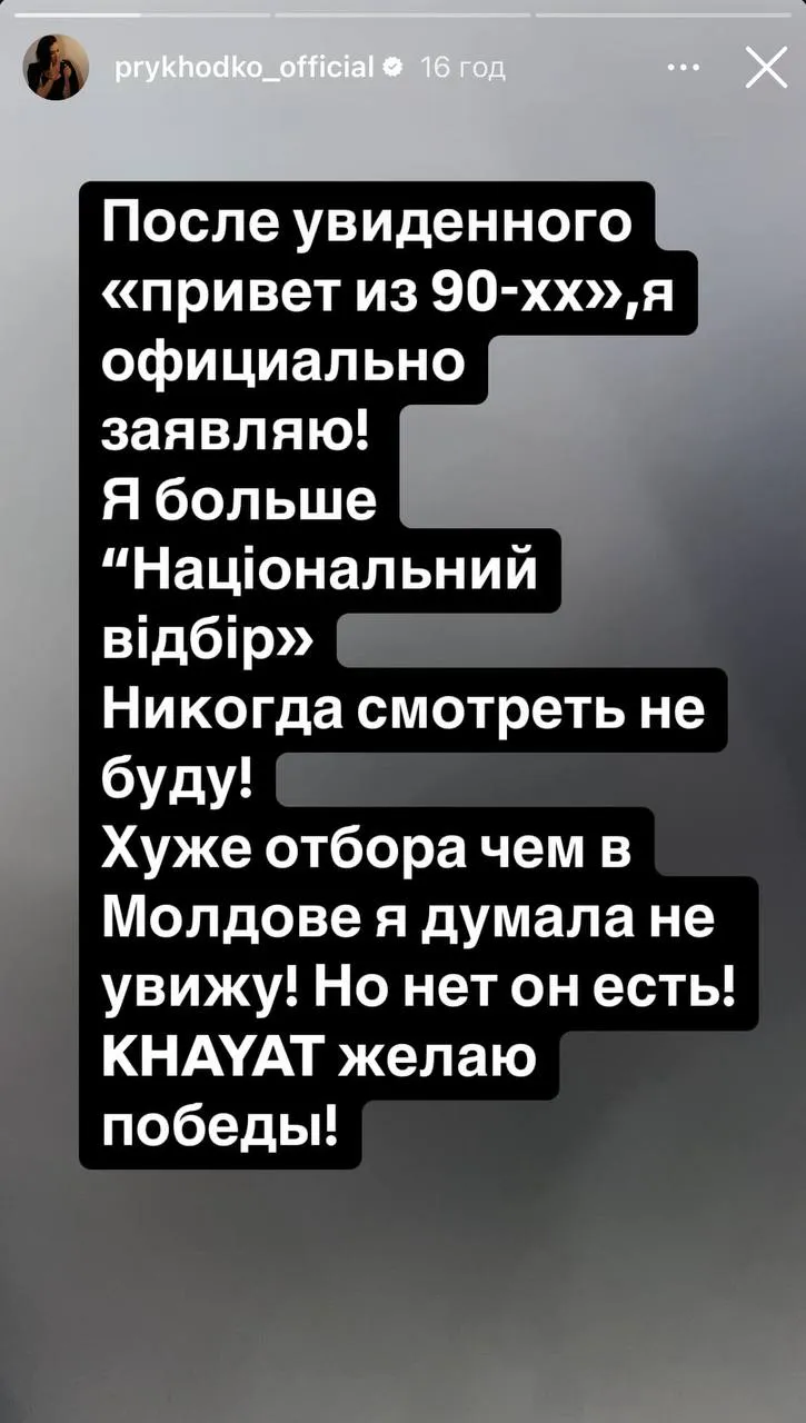 "После увиденного "привет из 90-х" я официально заявляю: больше национальный отбор никогда не буду смотреть. Хуже отбора, чем в Молдове, думала не увижу! Но он есть! KHAYAT, желаю победы!" – написала Анастасия Приходько.