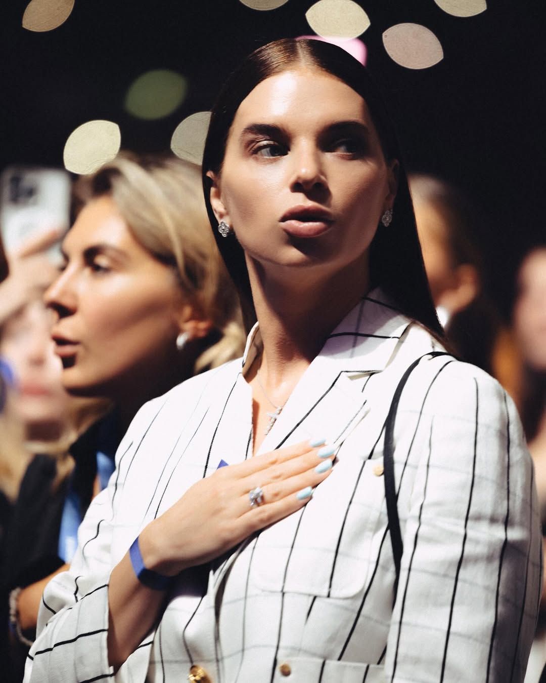 Жена Александра Усика предстала в стильном клетчатом костюме от Schiaparelli – жакете с асимметричным воротником и прямыми брюками.