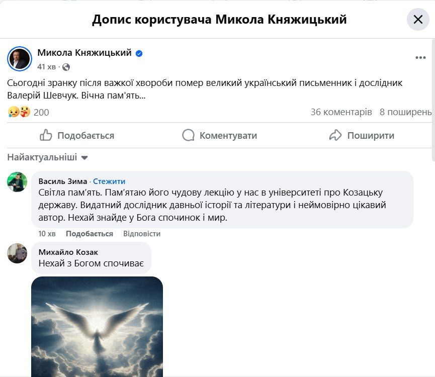 Николай Княжицкий сообщил о смерти Валерия Шевчука / Скриншот из фейсбука