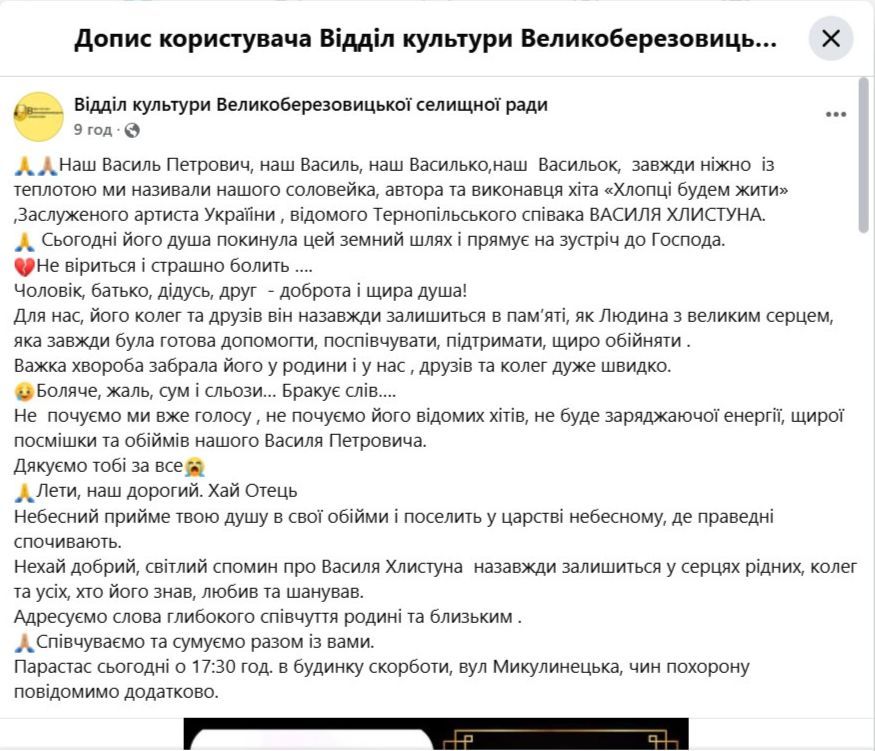 В отделе культуры Великоберезовицкого поселкового совета добавили, что больше не услышат голоса Василия Хлыстуна, хитов в его исполнении, не почувствуют заряженной энергии, объятий певца и не увидят его улыбку.