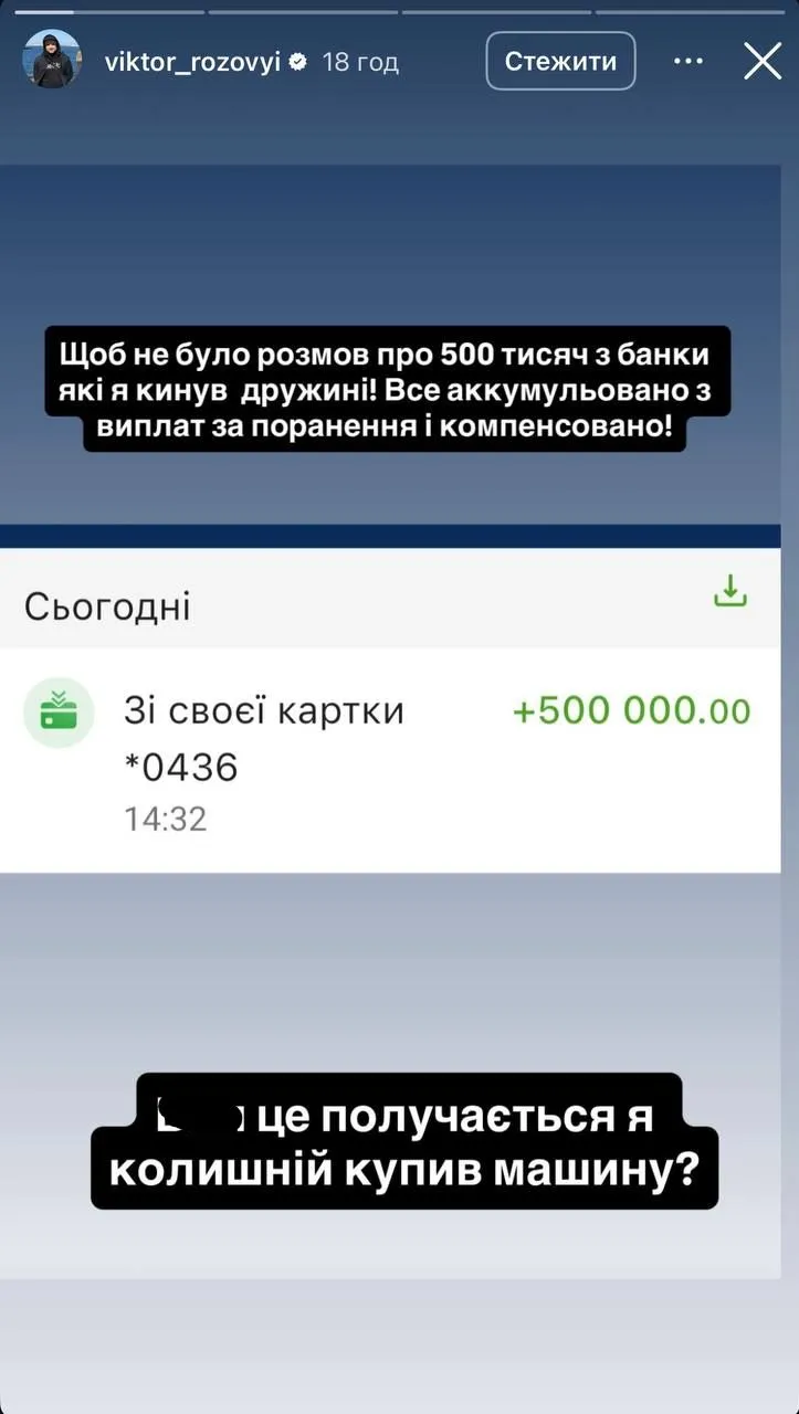 Виктор Розовый заявил, что у него сохранены все средства, что были на остатке на банке Ольги Мерзликиной. Во время развода женщина перевела ему около 2 миллионов 670 тысяч гривен, которые люди собрали на реабилитацию.